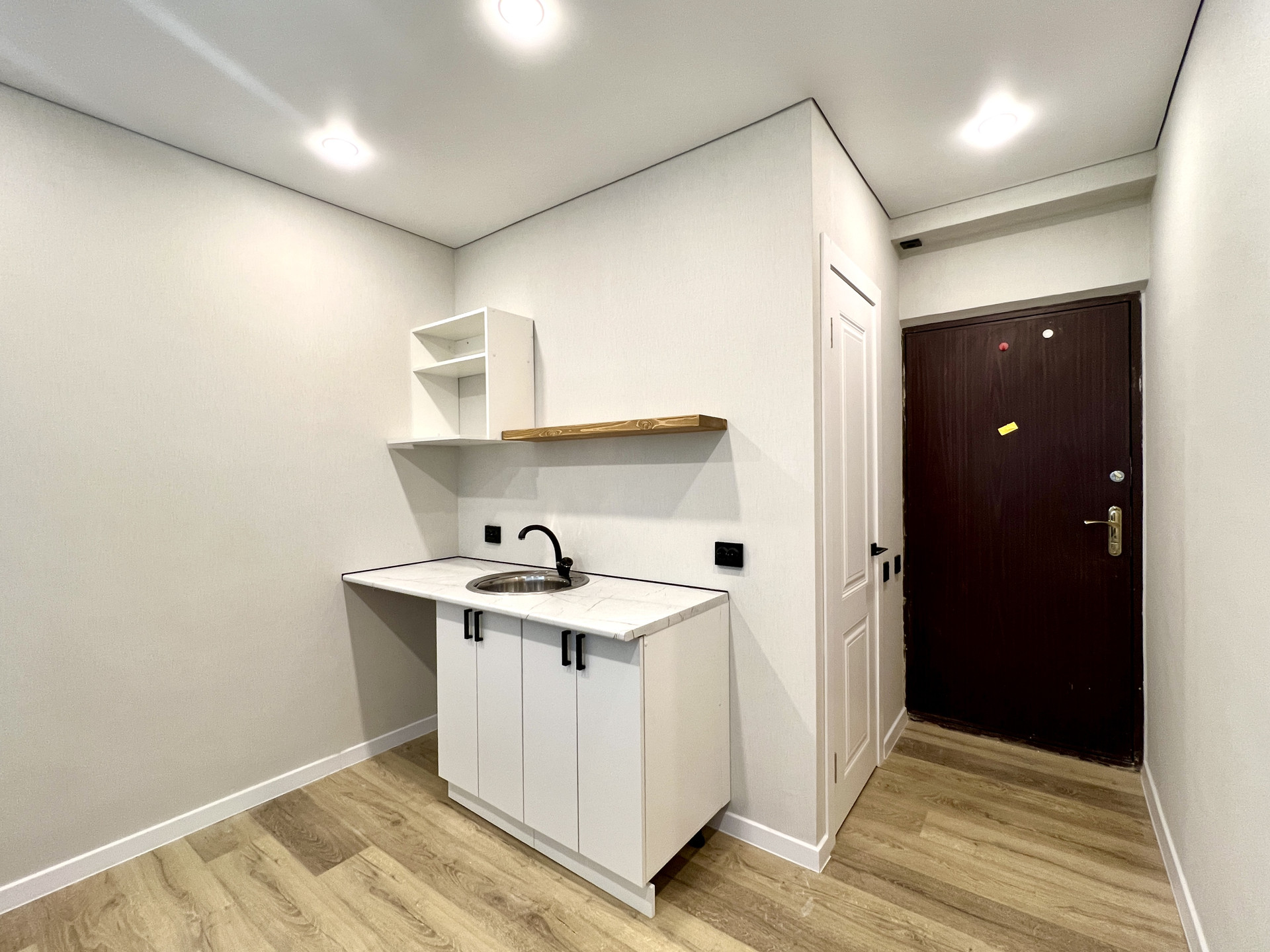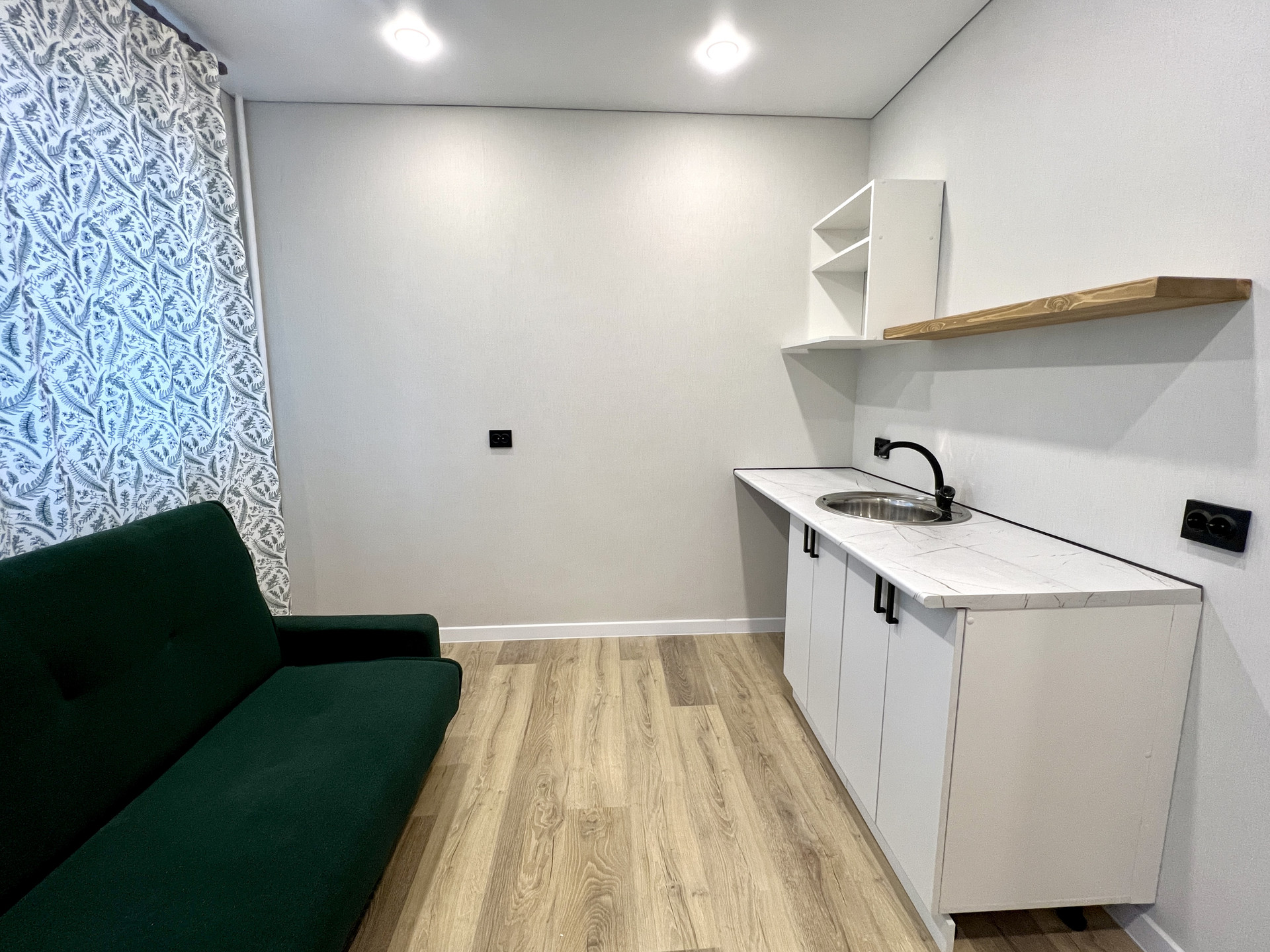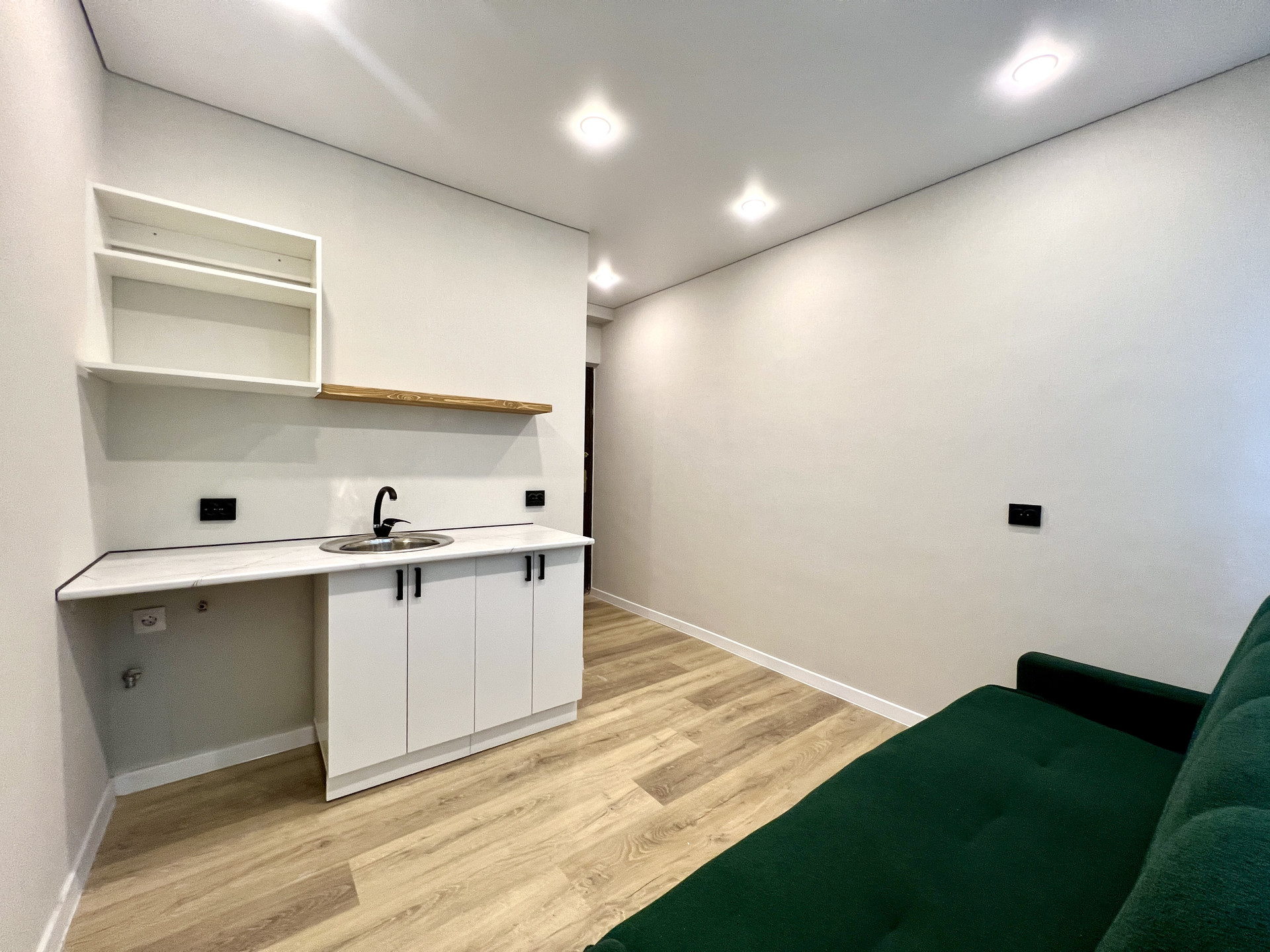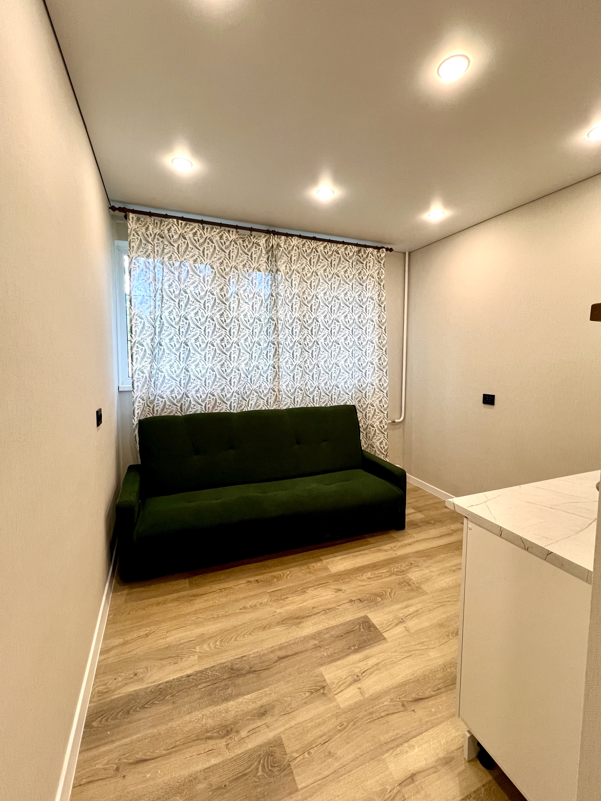 Студия в отличном состоянии, выполнен современный ремонт: заменены все коммуникации, установлено пластиковое окно, пол выложен ламинатом, оборудован натяжной потолок; санузел совмещен (личного пользования), отремонтирован, поменяны трубы, новая сантехника и смесители, полы и стены облицованы кафелем. После ремонта в студии никто не проживал.
