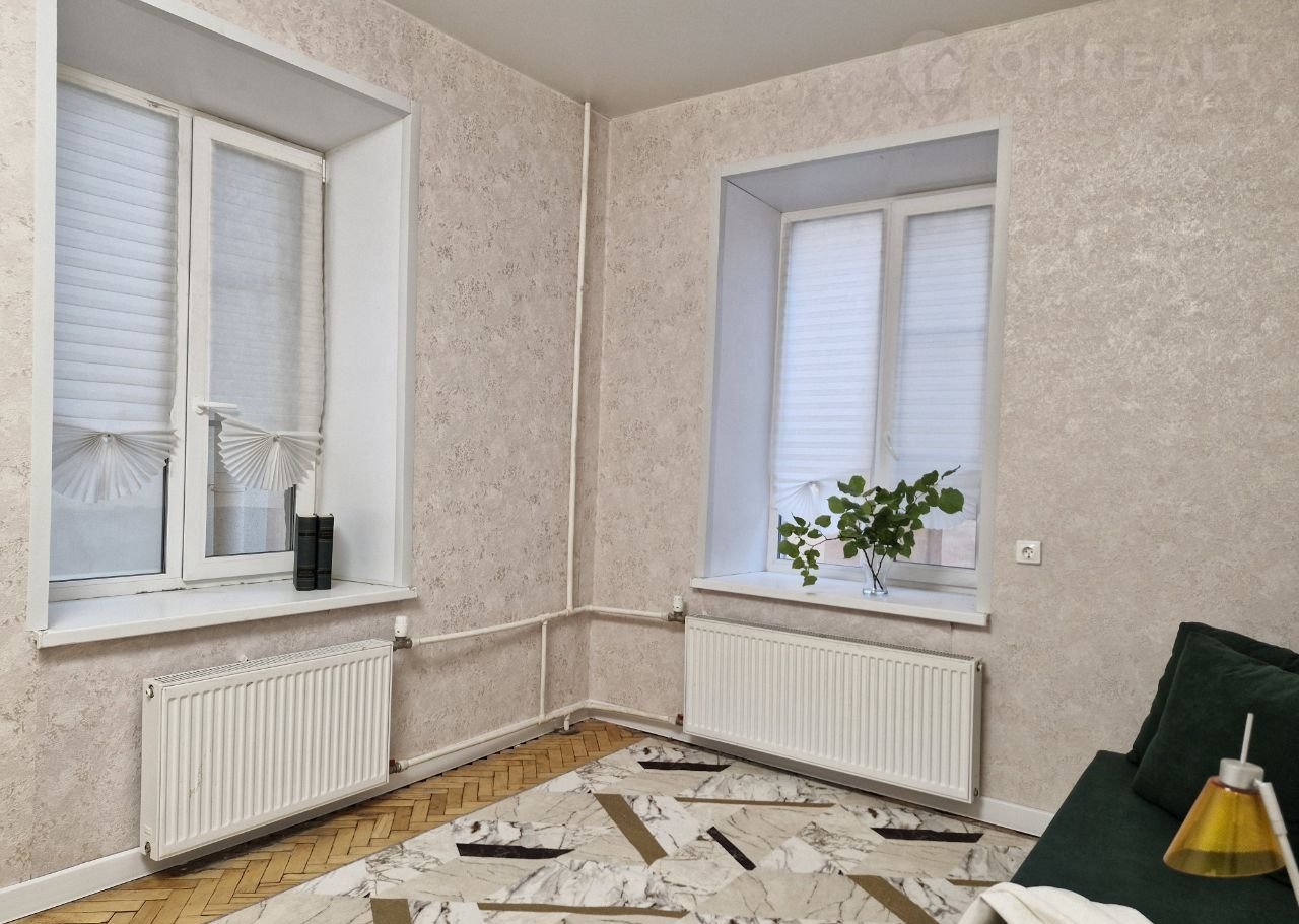 Комната светлая, теплая, тихая, правильной прямоугольной формы, 2 больших окна (стеклопакет) выходят во двор. Можно очень стильно зонировать пространство.
