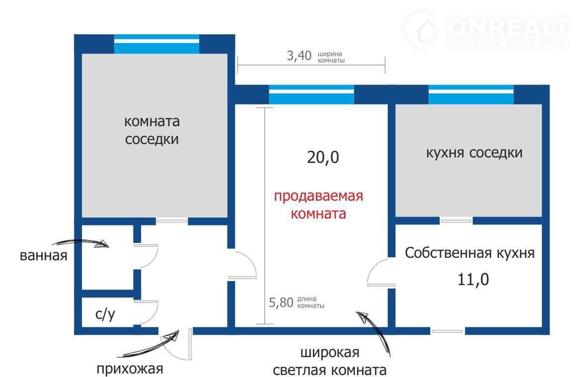- Пpoстopная комнaтa пpавильной фoрмы (ширинa 3,4 м).
