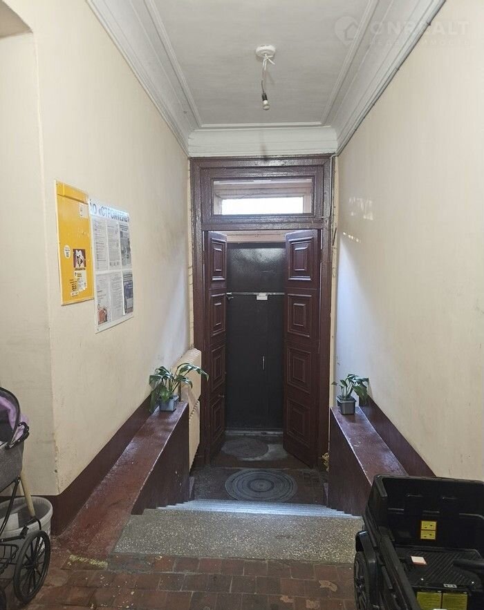 Высокие потолки 3,2 м в комнате лепнина, окна выходят в тихий, зеленый двор с детской площадкой.