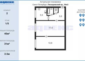 Двухкомнатная квартира на продажу, 45 м2, Пискарёвский проспект, 58к2