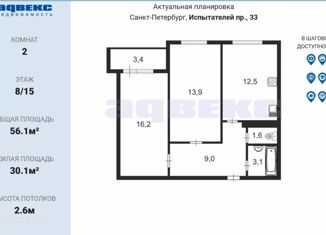 Продажа двухкомнатной квартиры, 56.1 м2, проспект Испытателей, 33