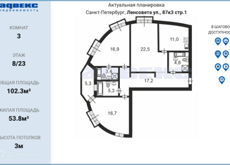 Трехкомнатная квартира на продажу, 102.3 м2, улица Ленсовета, 87к3