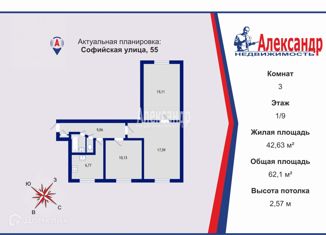 Продается трехкомнатная квартира, 62.1 м2, Софийская улица, 55
