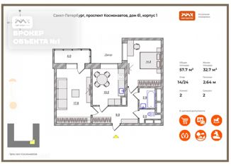 Продается 2-комнатная квартира, 57.7 м2, проспект Космонавтов, 61к1