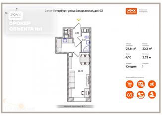 Продам квартиру студию, 27.8 м2, Малый проспект Васильевского острова, 63/14