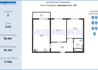 Двухкомнатная квартира на продажу, 56.4 м2, улица Красуцкого