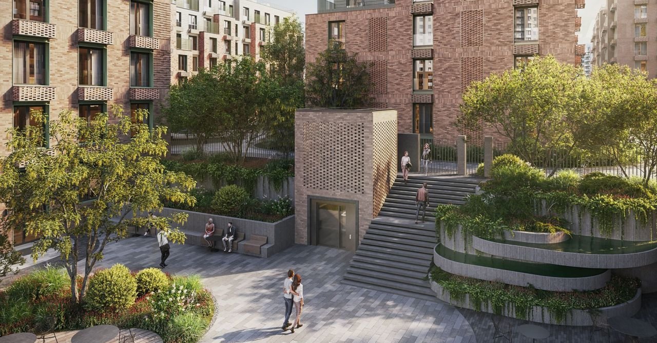 Дворы домов проектируются закрытыми и свободными от автомобилей. Проектом предусмотрен двухуровневый паркинг на 721 машиноместо с доступом на лифте, парадным входом и бесконтактной системой въезда с определением гос. номера автомобиля. Внутриквартальная территория приподнята над поверхностью земли на 3,5 м. Образующееся между домами «плато», куда ведут пологие лестницы и пандусы, предоставляет жителям благоустроенное пространство где предусмотрены безопасные игровые и спортивные площадки для детей разного возраста, амфитеатр, а также места для общего досуга и общения жителей. Проектом предусмотрены колясочные, велопарковки, круглосуточное видеонаблюдение. Отсутствие ступенек и крылец обеспечит удобный доступ в парадные для всех категорий граждан.