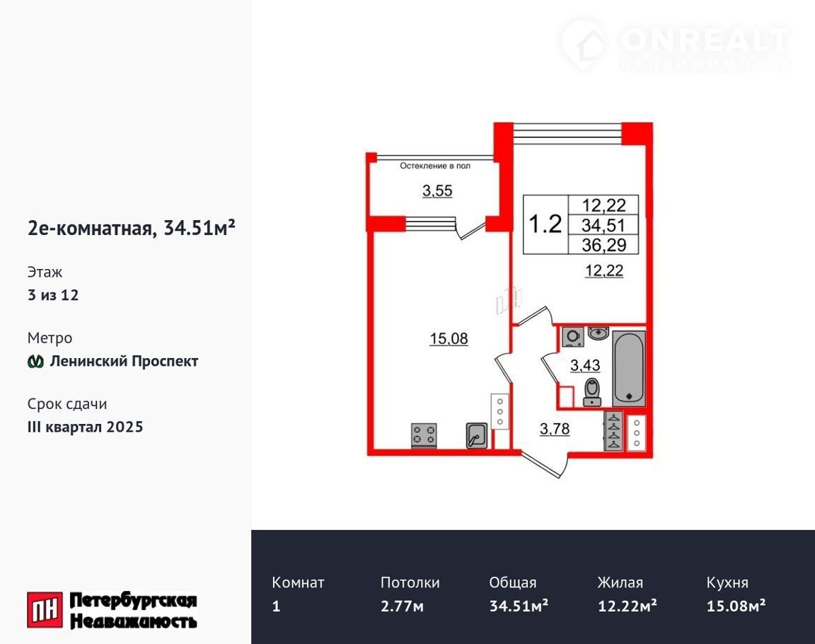 1-комнатная квартира, 34.5 м2, этаж 3 / 12, на продажу в Санкт-Петербурге, 1-й Предпортовый проезд, 1