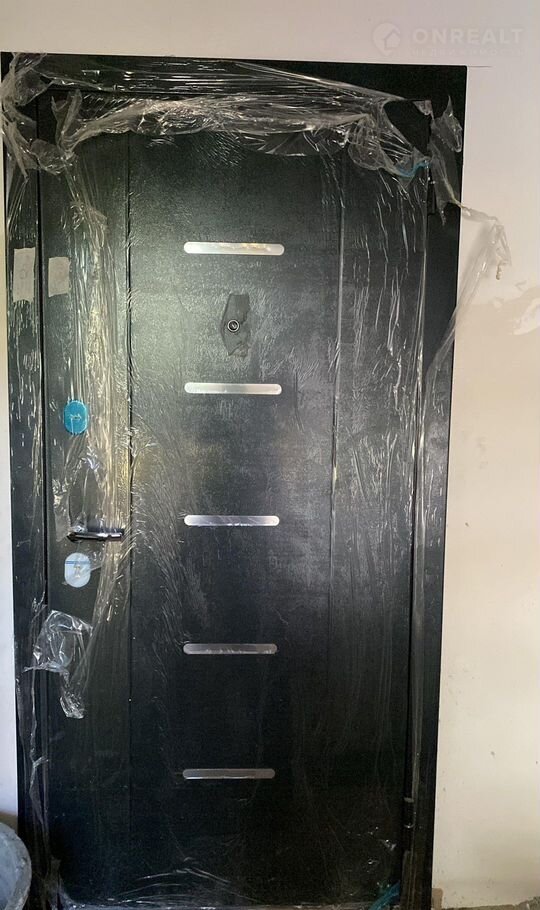 Современная входная дверь, на которой установлен умный домофон.