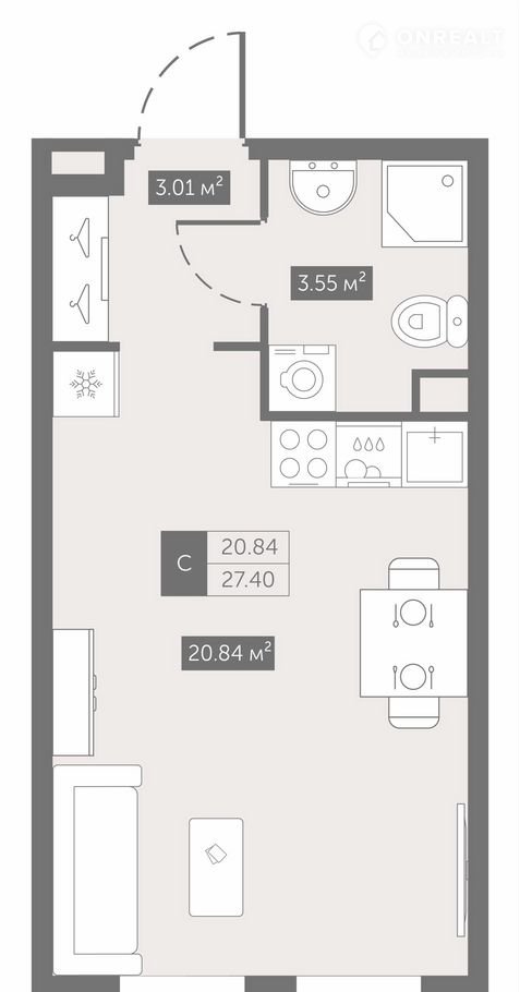 Общая площадь 27.4 м2