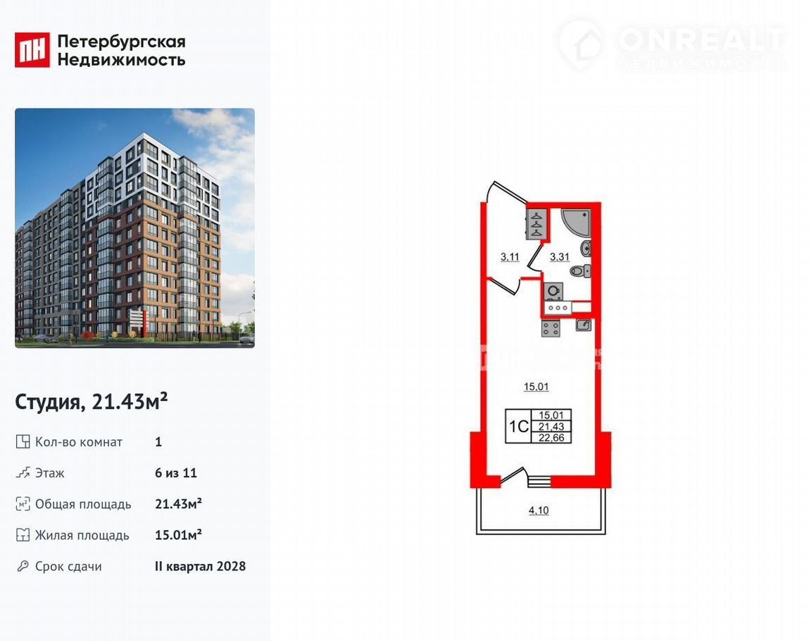 Квартира студия, 21.4 м2, этаж 6 / 11, на продажу в Санкт-Петербурге