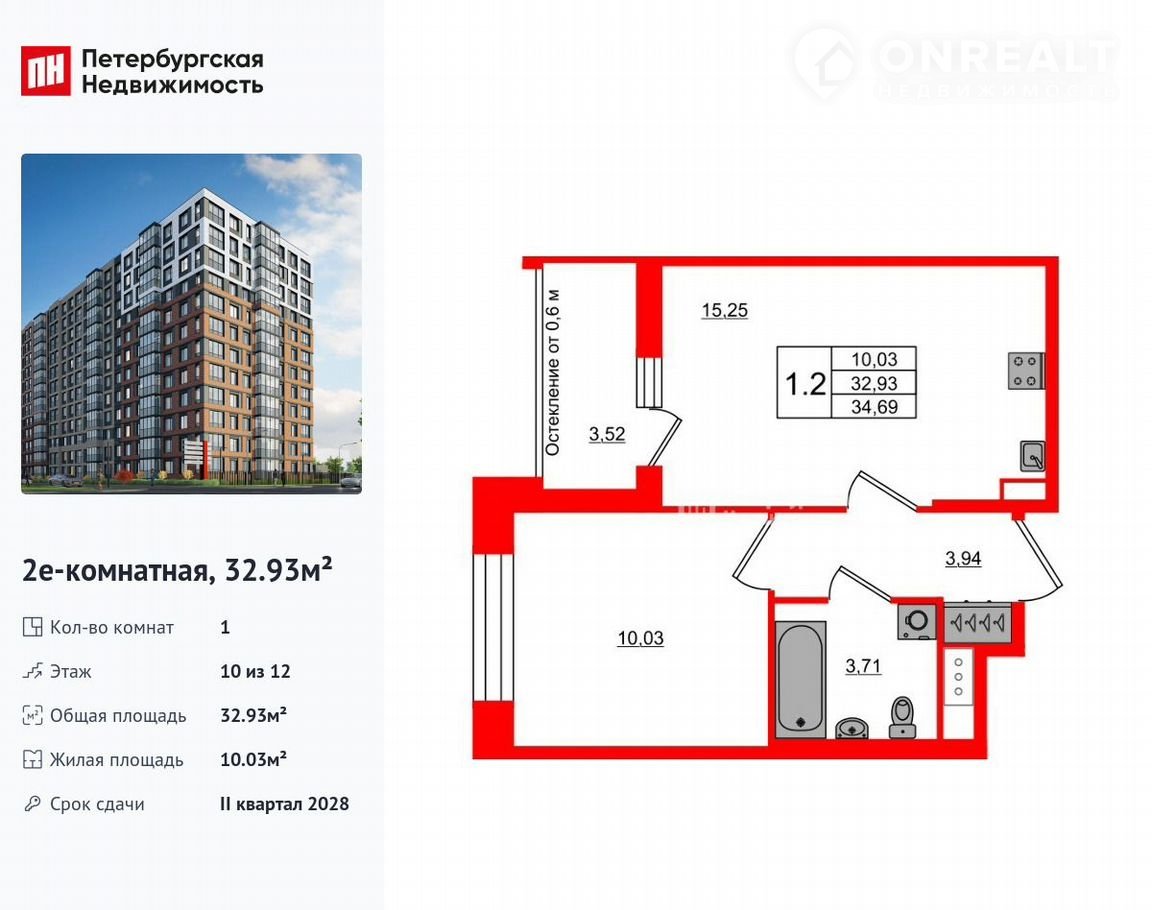 1-комнатная квартира, 32.9 м2, этаж 10 / 12, на продажу в Санкт-Петербурге