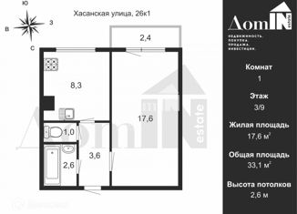 Продается однокомнатная квартира, 33.6 м2, Хасанская улица, 6к1