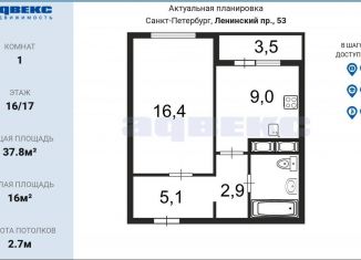 Однокомнатная квартира на продажу, 38 м2, Ленинский проспект, 53к1