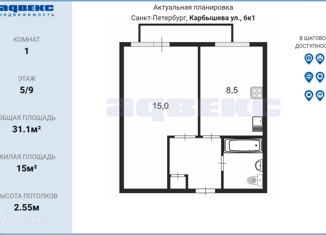 Продаю 1-комнатную квартиру, 31.1 м2, улица Карбышева, 6к1