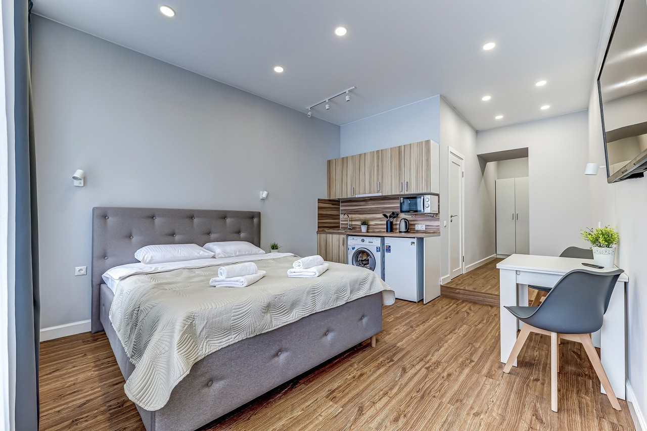 Мебель и техника: 2-х спальная кровать, стол, стулья, ТВ - в спальной зоне; шкафы для посуды, плита 2-х конфорочная индукционная, стиральная машина - в кухне; душевая кабина, сантехника - в санузле.В апартаментах выполнен качественный дизайнерский евро ремонт, установлены новые трубы, сантехника, стеклопакет, электрика, батареи отопления. В качестве напольного покрытия в комнате использован ламинат, в санузле - кафель.Высокие потолки (3,17м - в апартаментах, 3,08 - в санузле). Вид на город. Апартаменты в собственности и полностью без обременений. Отдельный кадастр.Мини-отель нового поколения с удобными сервис-услугами. Удачное расположение - центр города, в 50м от набережной Большой Невки. 15 мин - до Невского проспекта и Дворцовой набережной, 10 мин на авто до выезда на ЗСД, недалеко побережье Финского залива.