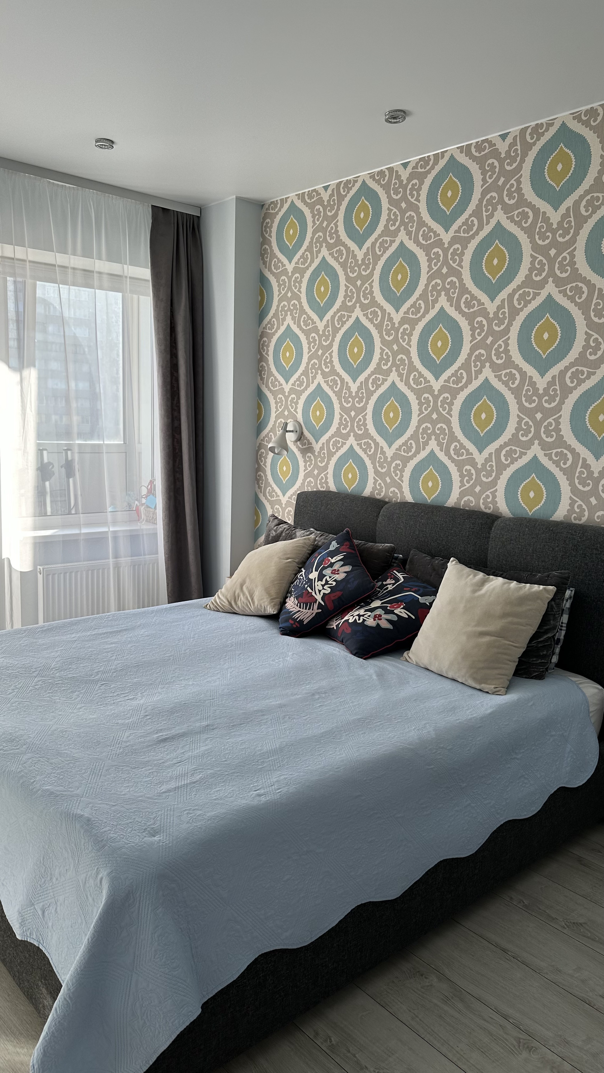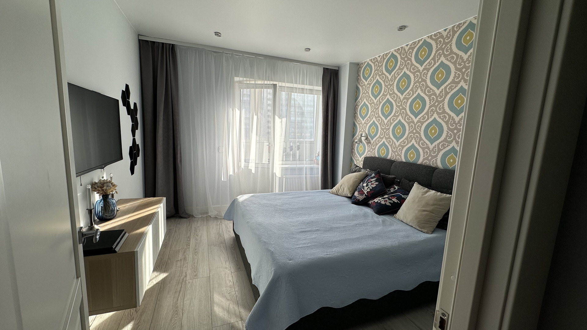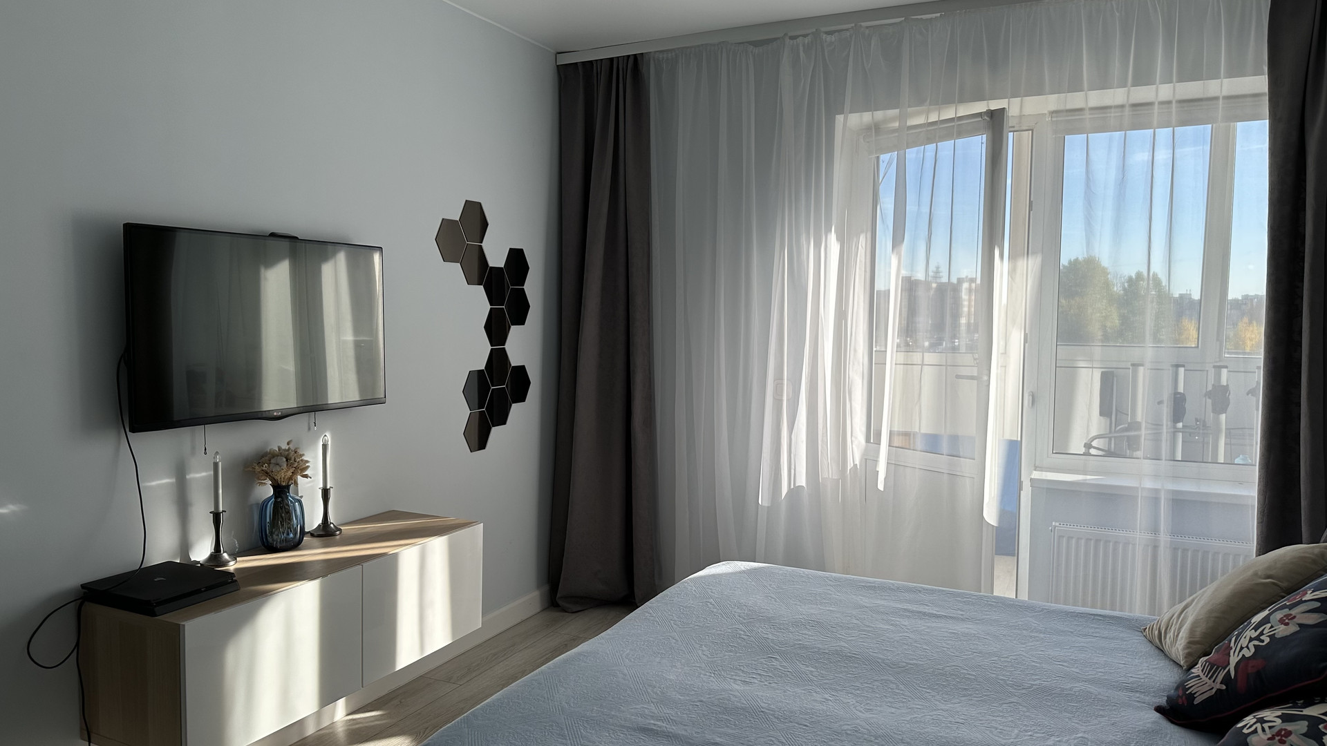 В спальне комфортная широкая (180 см) кровать hilding anders с подъемным механизмом и ортопедическим матрасом. Вместительный гардероб. Выход на балкон