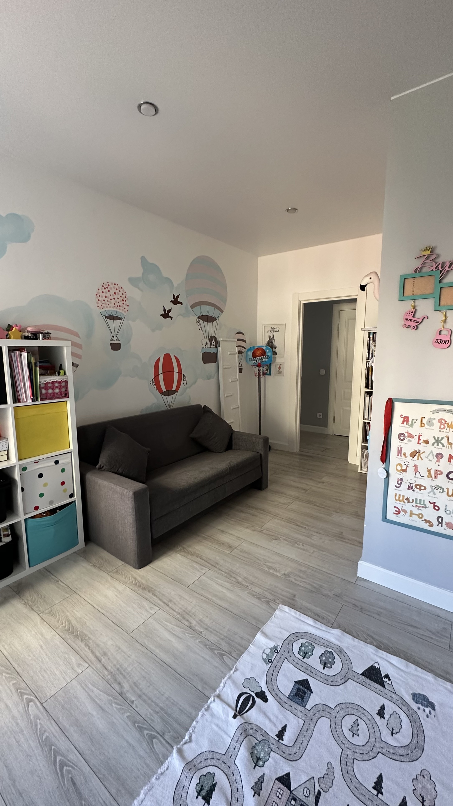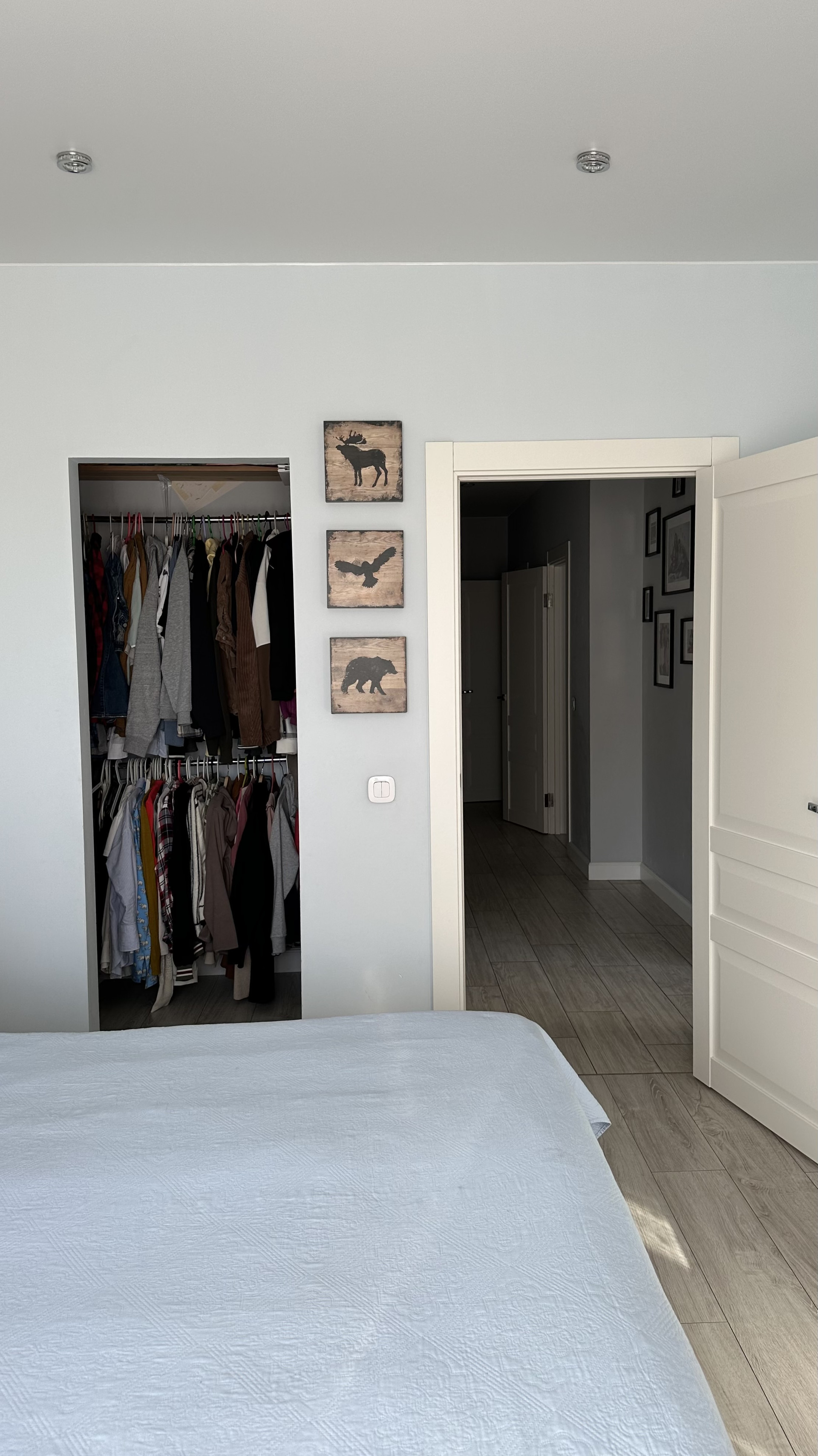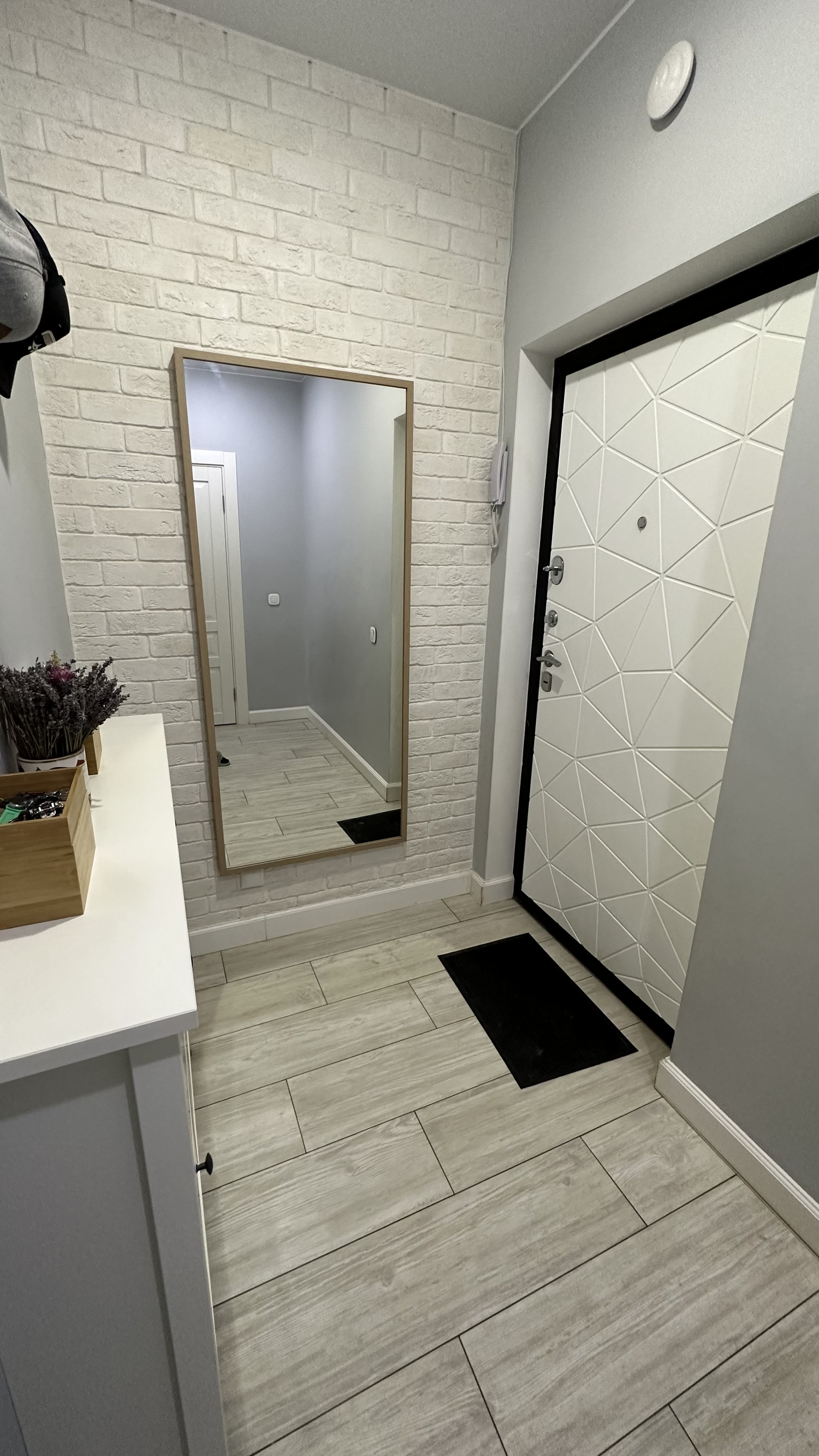 В квартире две гардеробных: в коридоре и в спальне. В коридоре теплый пол.