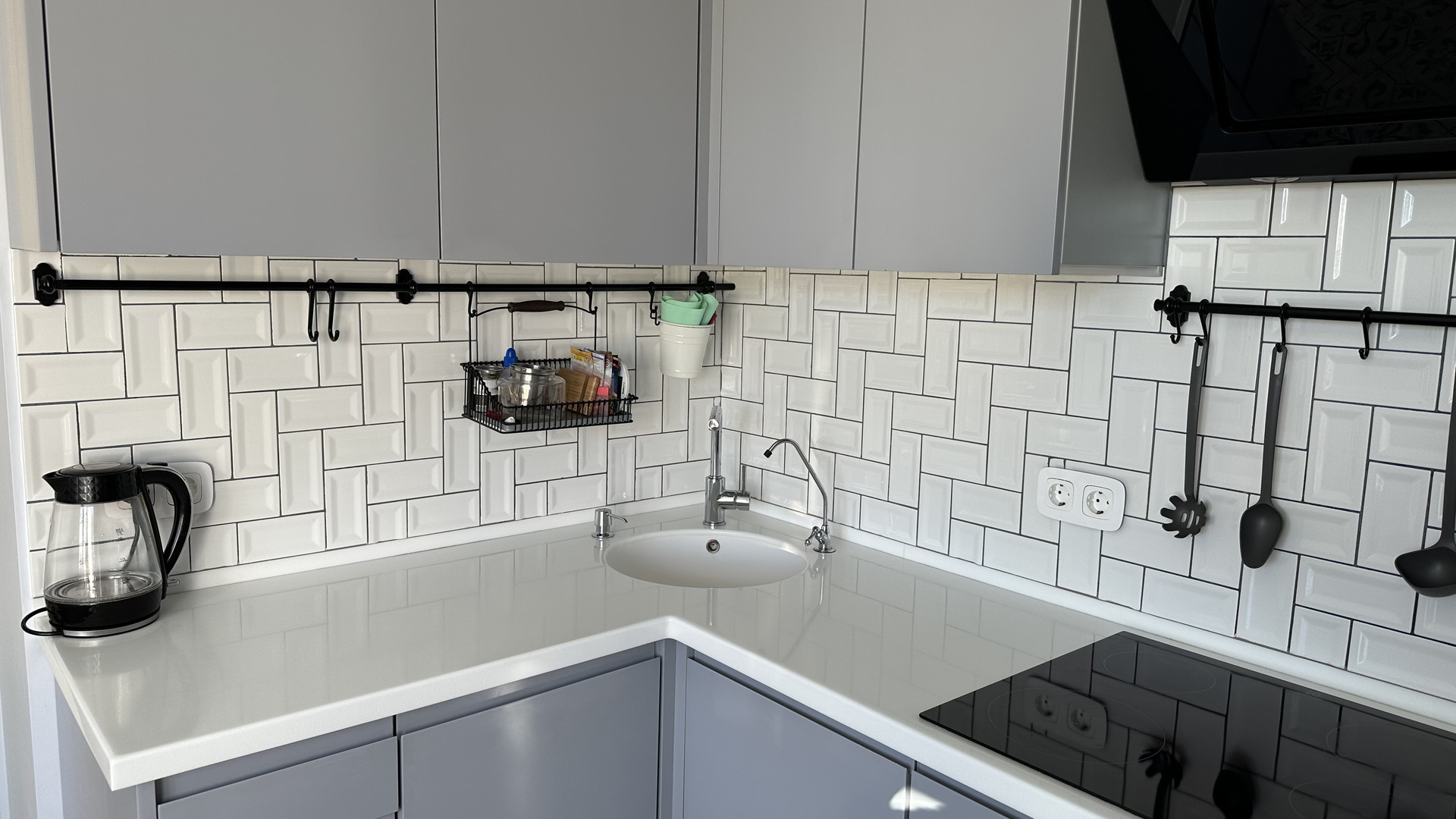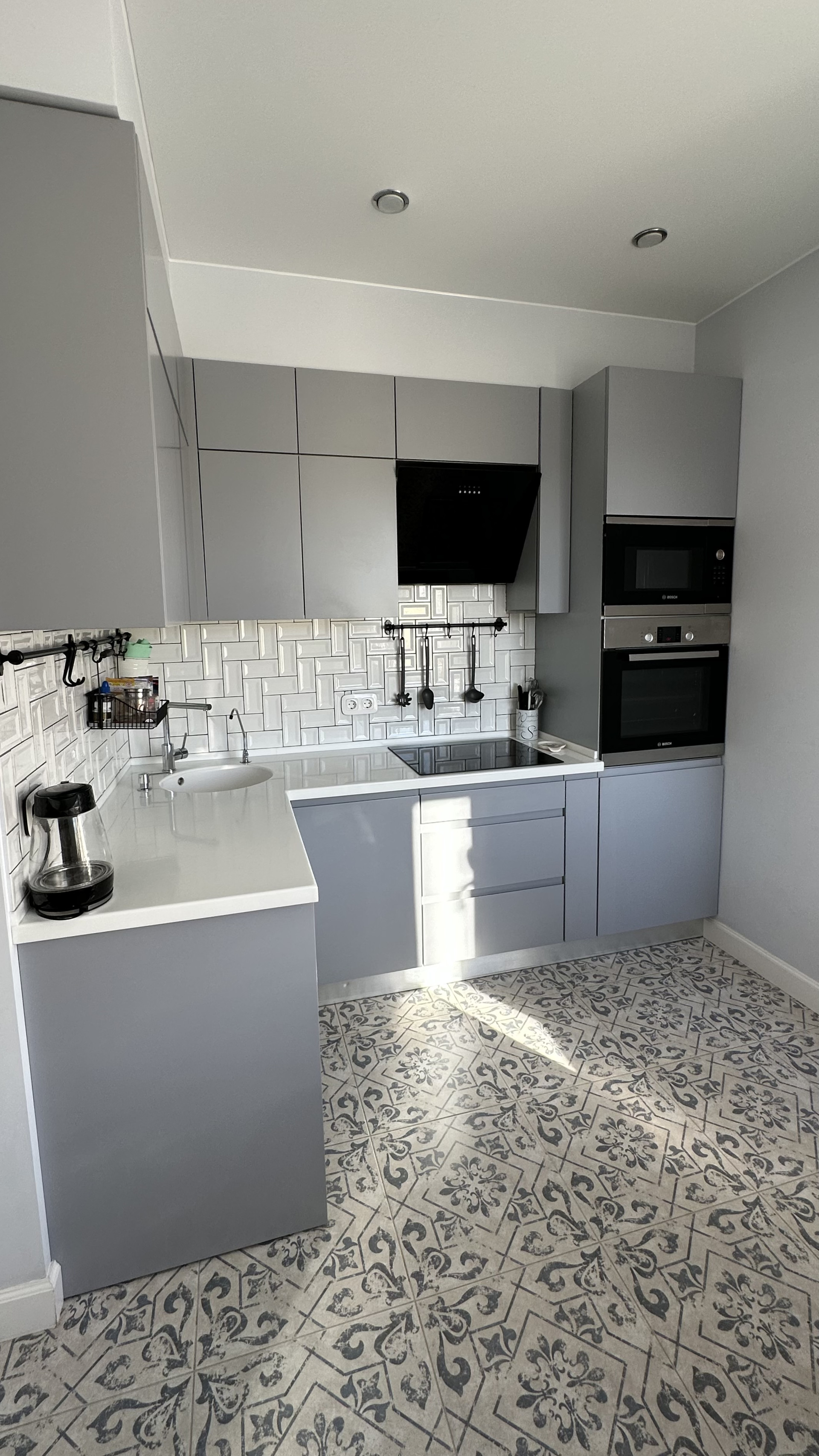 На кухне: кухонный гарнитур под заказ из итальянских материалов, доводчики blum, столешница с литой раковиной из искусственного камня, встроенные СВЧ и духовка bosch, встроенная посудомойка siemens и холодильник LG, индукционная плита electrolux