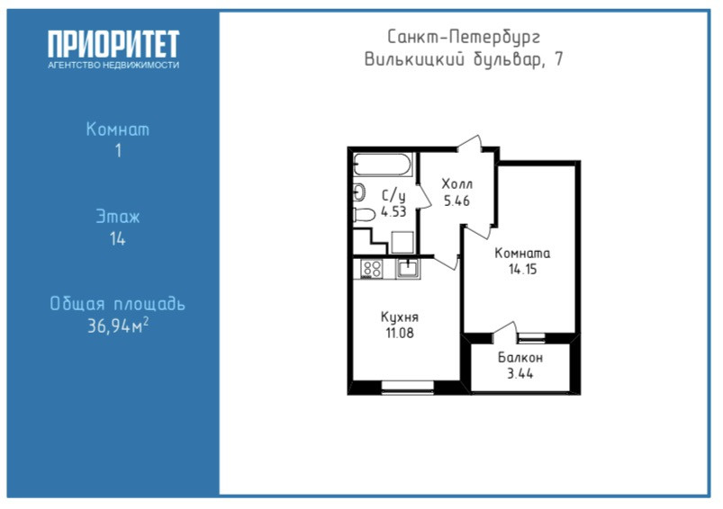 1-комнатная квартира, 36.94 м2, этаж 14 / 19, на продажу в Санкт-Петербурге, Вилькицкий бульвар, 7
