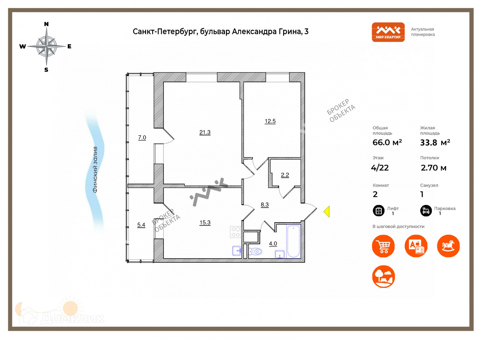 Обратите внимание на удобную планировку – окна на две стороны - квартира всегда залита светом, гардеробная, 2 лоджии, с которых виден залив, кухня 15 м2 и просторная прихожая - 9 м2.