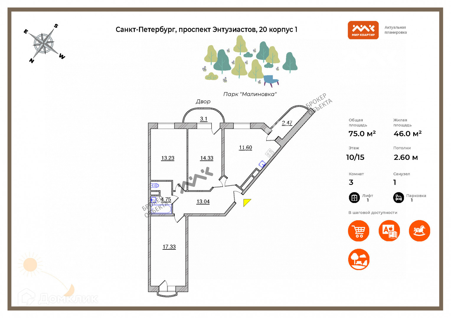 3-комнатная квартира, 74.3 м2, этаж 10 / 15, на продажу в Санкт-Петербурге, проспект Энтузиастов, 20к1