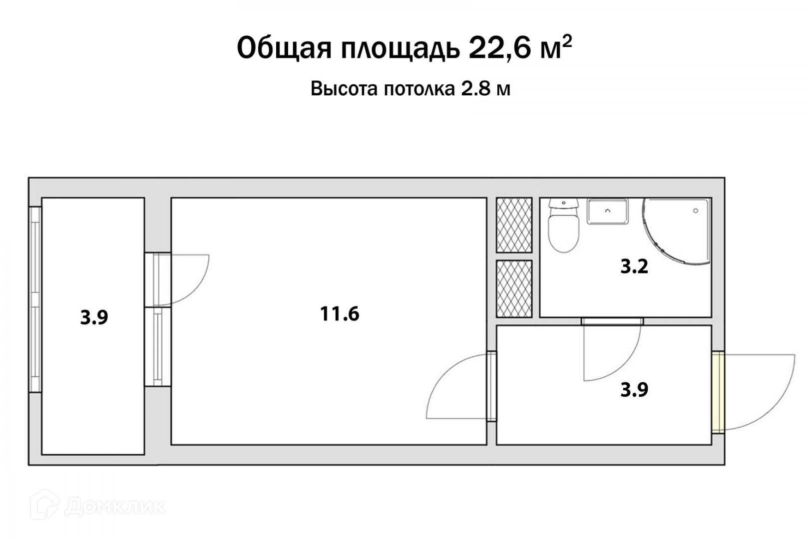 — площадь помещения 22.6 кв.м. Комната 11.6, коридор 3.9, совмещенный санузел 3.5, лоджия с панорамным остеклением 3.9. Высота потолка 2.8;