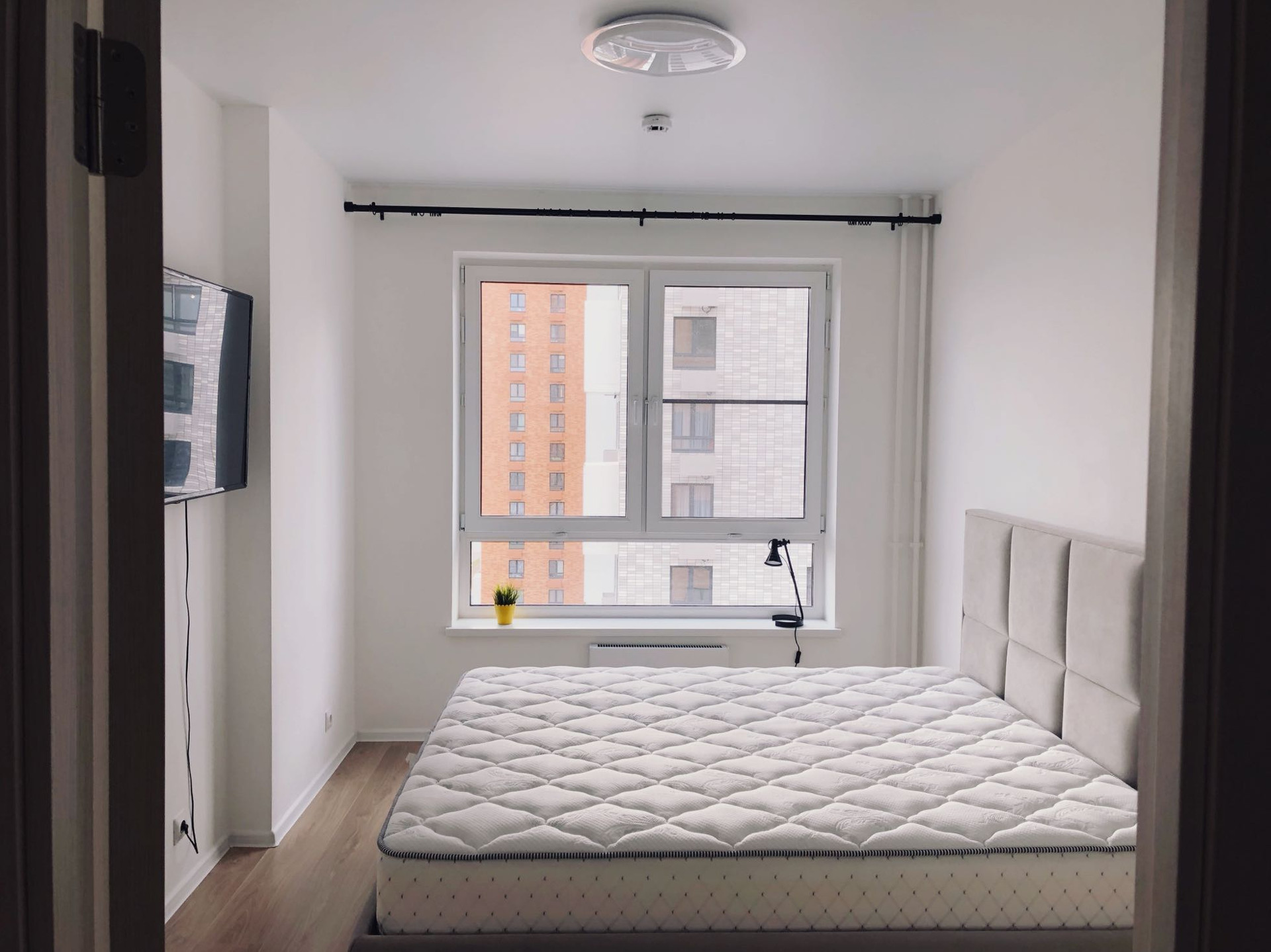 В спальне новая большая кровать с современным ортопедическим матрацем.