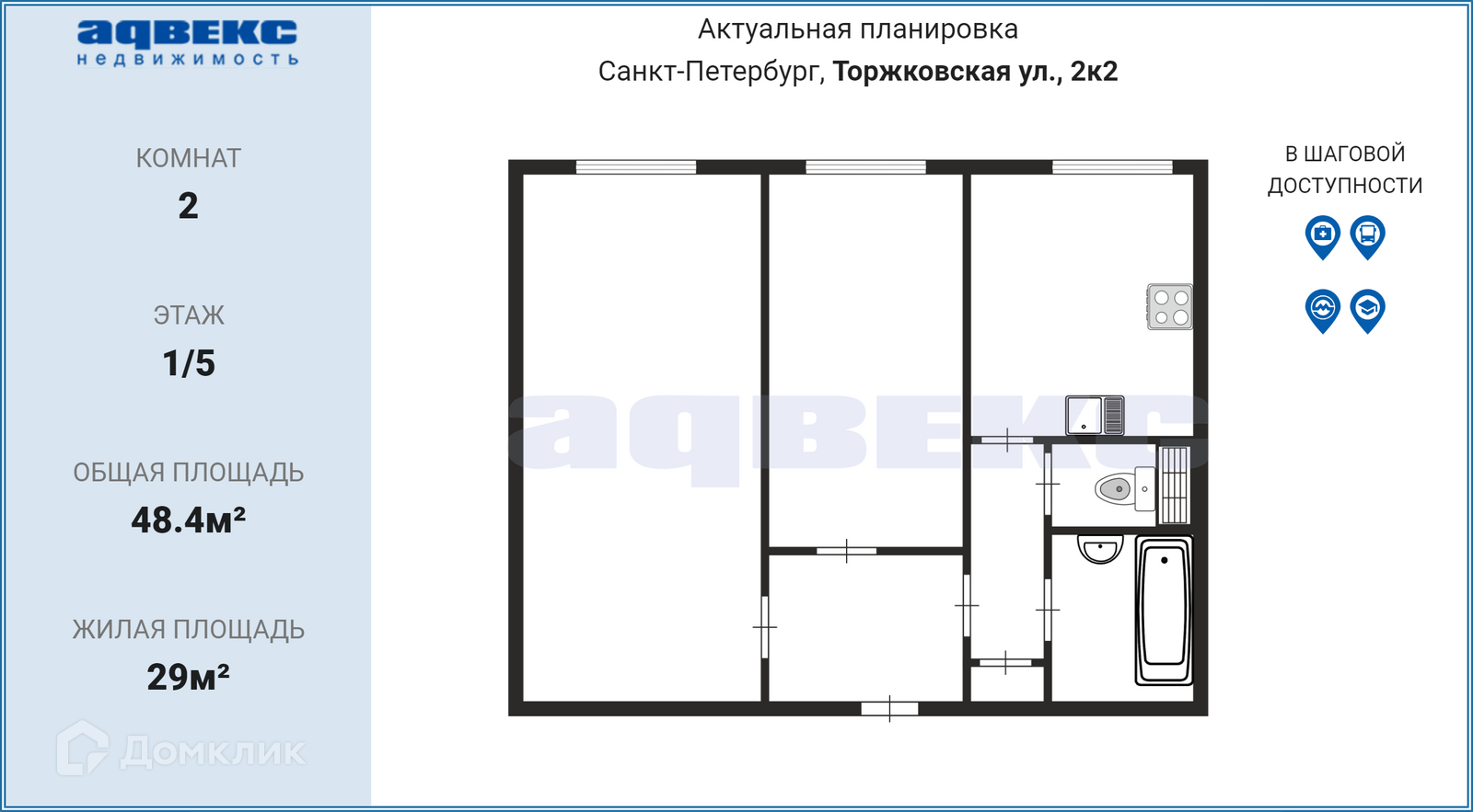 2-комнатная квартира, 48.4 м2, этаж 1 / 5, на продажу в Санкт-Петербурге, Торжковская улица, 2к2