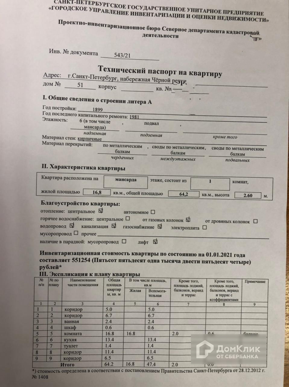 1-комнатная квартира, 64.2 м2, этаж 5 / 6, на продажу в Санкт-Петербурге, набережная Чёрной речки, 51
