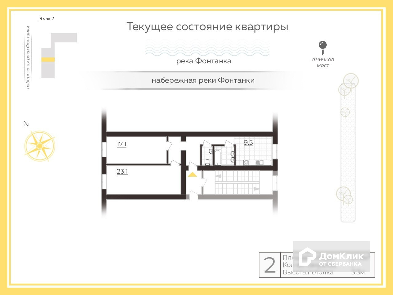 2-комнатная квартира, 65 м2, этаж 2 / 4, на продажу в Санкт-Петербурге, набережная реки Фонтанки, 46