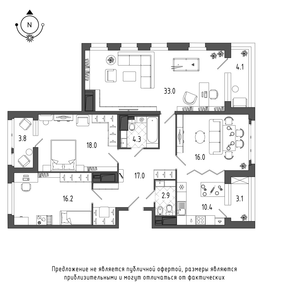 Просторная и удобная для жизни квартира оригинальной планировки с тремя спальнями – отличный выбор для современной семьи с детьми. • Квартира ориентирована на три стороны света. • В прихожей можно установить вместительную гардеробную или систему хранения. • Центр притяжения для всей семьи и гостей – просторная кухня-гостиная европейского типа площадью более 30 метров. В кухне-гостиной два больших окна, пространство можно разделить на зону готовки, столовую часть и зону отдыха. • Конфигурация комнат позволит организовать пространство с учётом потребностей каждого члена семьи. Большая жилая площадь комнат позволит обустроить дополнительные места для чтения, хобби или занятий спортом. • Комната рядом с кухней-гостиной ориентирована на две стороны света, в ней большое окно с увеличенным остеклением и широкая лоджия. • Две другие комнаты максимально удалены от входа. Самая дальняя от входа комната ориентирована на две стороны света, в ней два окна. • Два просторных санузла, площадь которых позволит разместить всю необходимую мебель, сантехнику, хозяйственный блок со стиральной машиной. Гостевой санузел при входе с возможностью размещения душевой кабины, другой санузел совмещён с ванной.