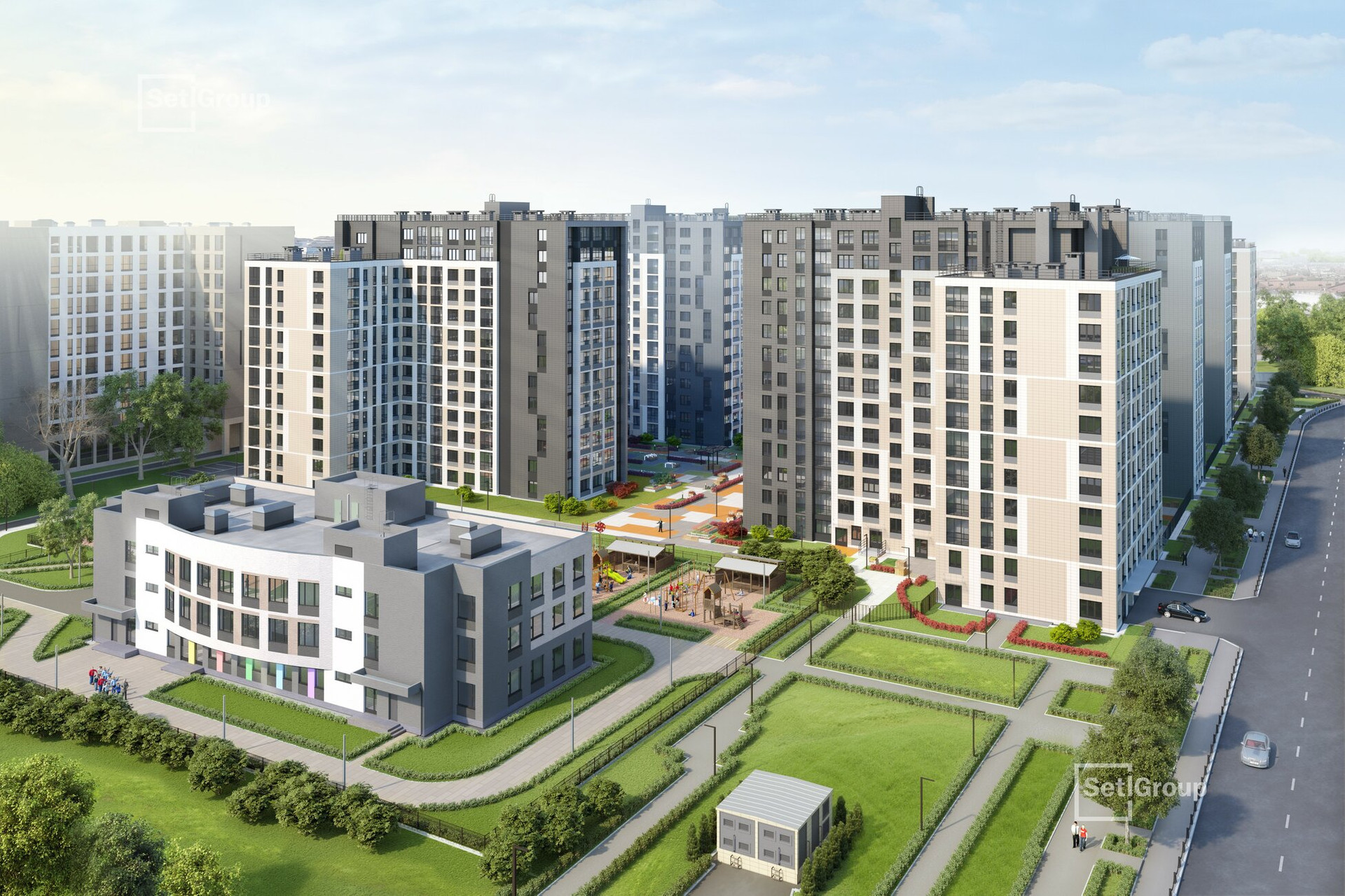 Перед домами находятся детский сад с бассейном и стадион с полем для футбола, площадкой для волейбола и баскетбола. Стадион размещен отдельно от дворов: игры не будут мешать отдыху остальных жителей.