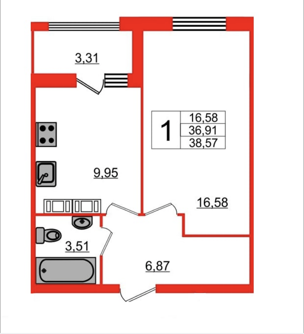 Жилая площадь 16.58 м2