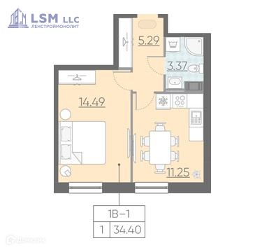 Общая площадь 34.4 м2