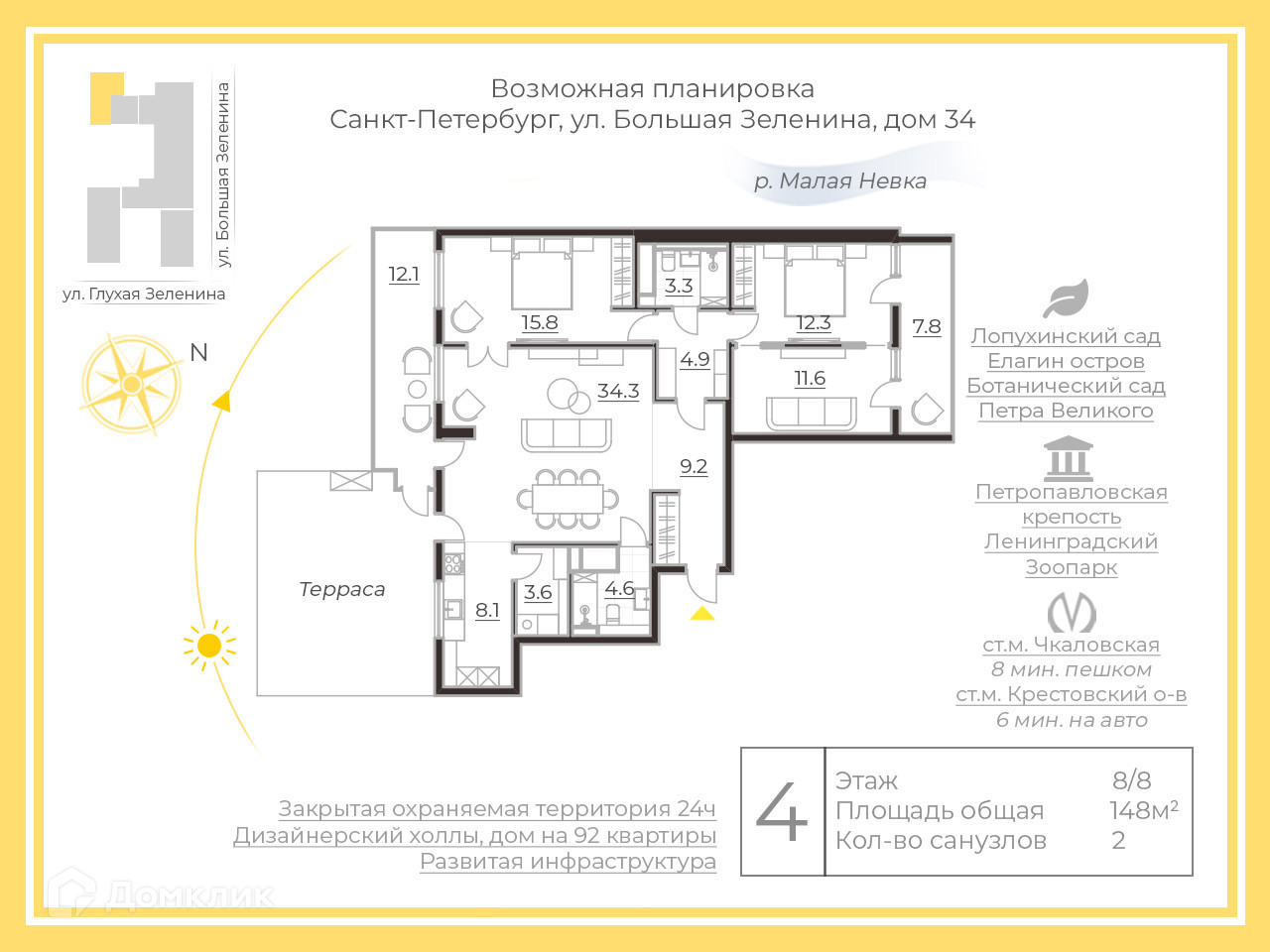 4-комнатная квартира, 148 м2, этаж 8 / 8, на продажу в Санкт-Петербурге, Большая Зеленина улица, 34