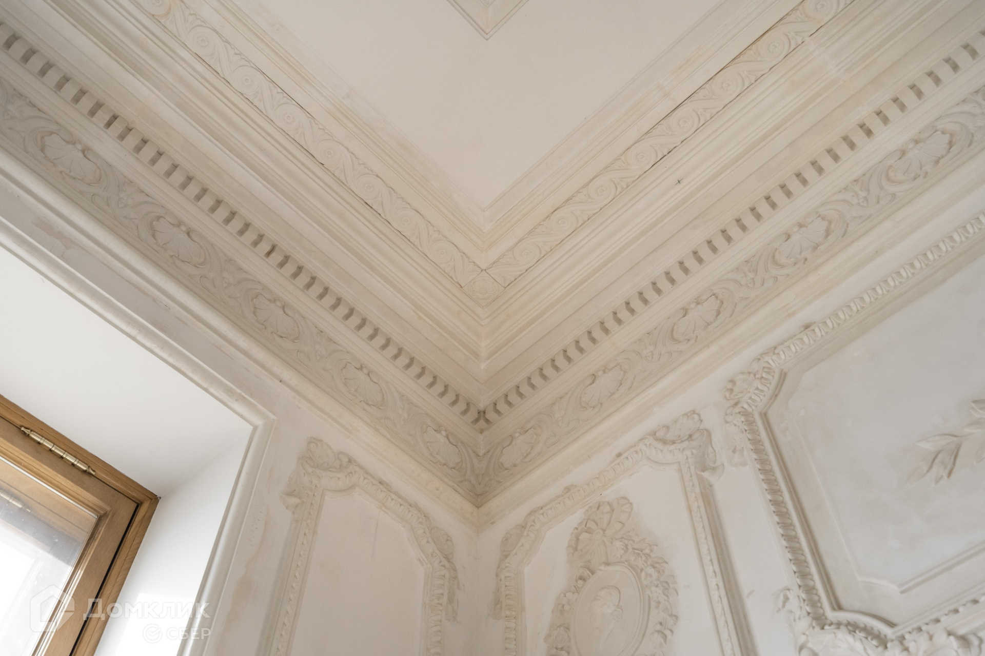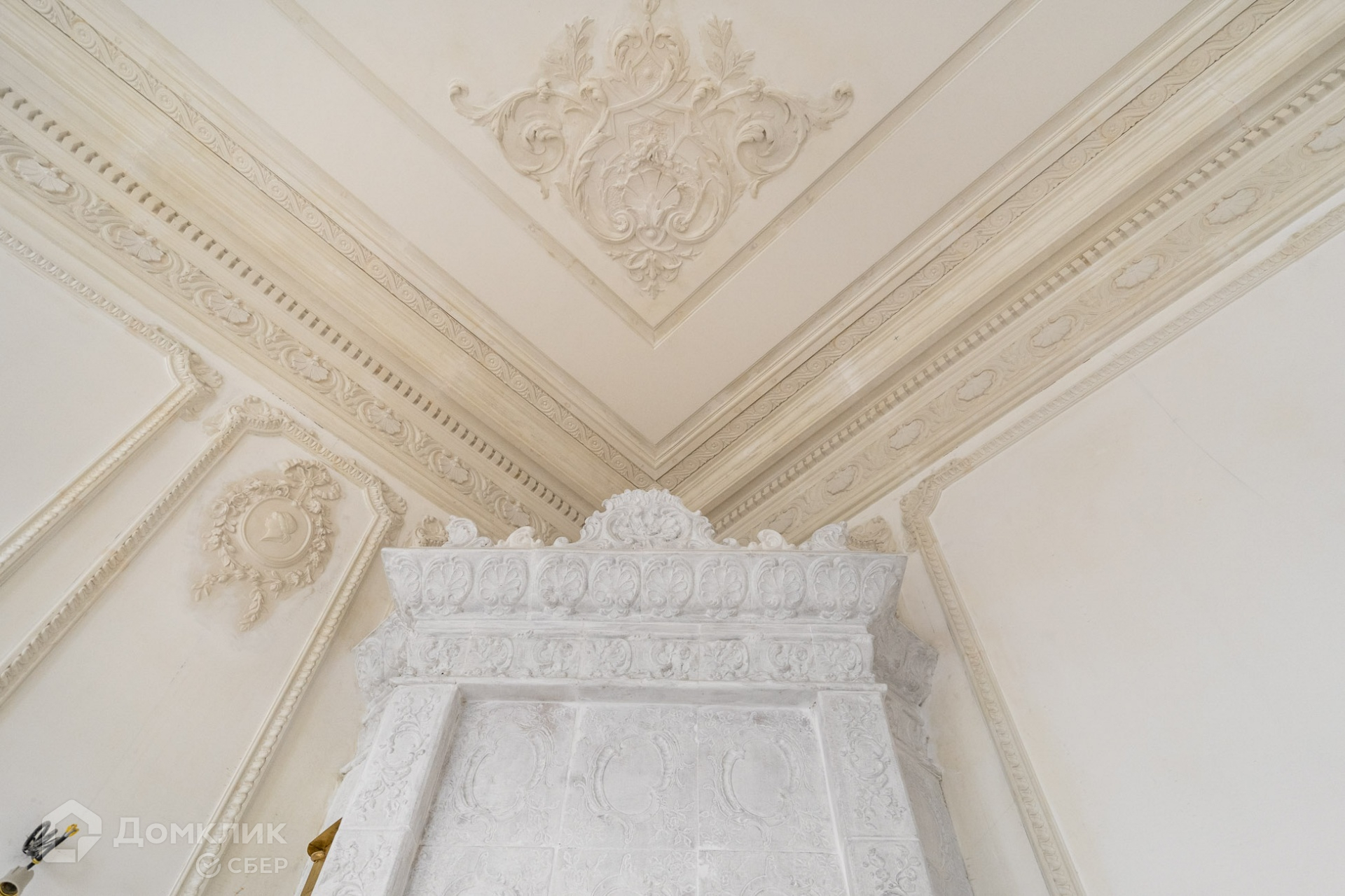  Восстановленная историческая гипсовая лепнина на стенах и потолках (по силиконовым матрицам, снятым с оригинальных сохранившихся частей).
