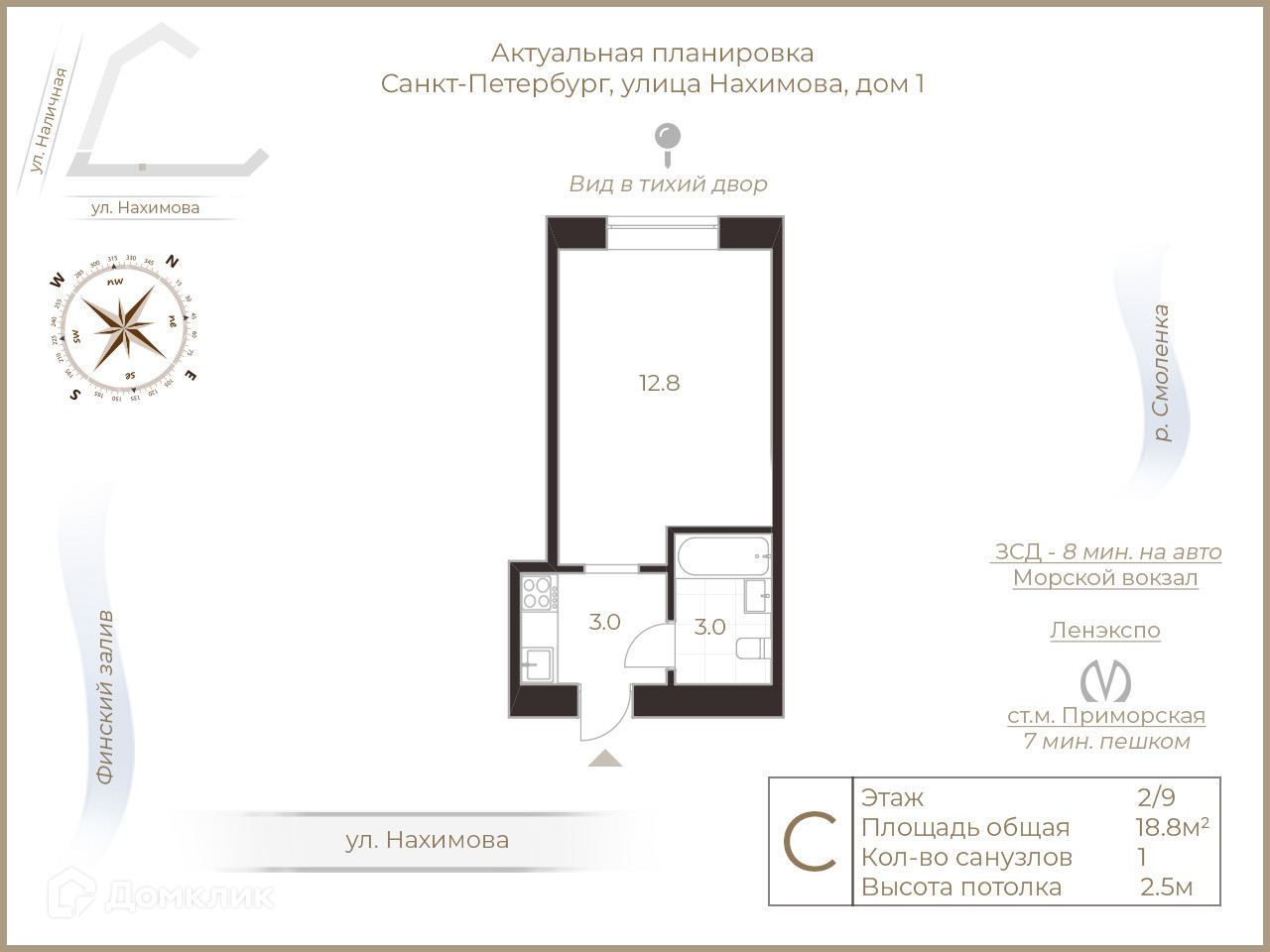 Квартира студия, 18.8 м2, этаж 2 / 9, на продажу в Санкт-Петербурге, улица Нахимова, 1
