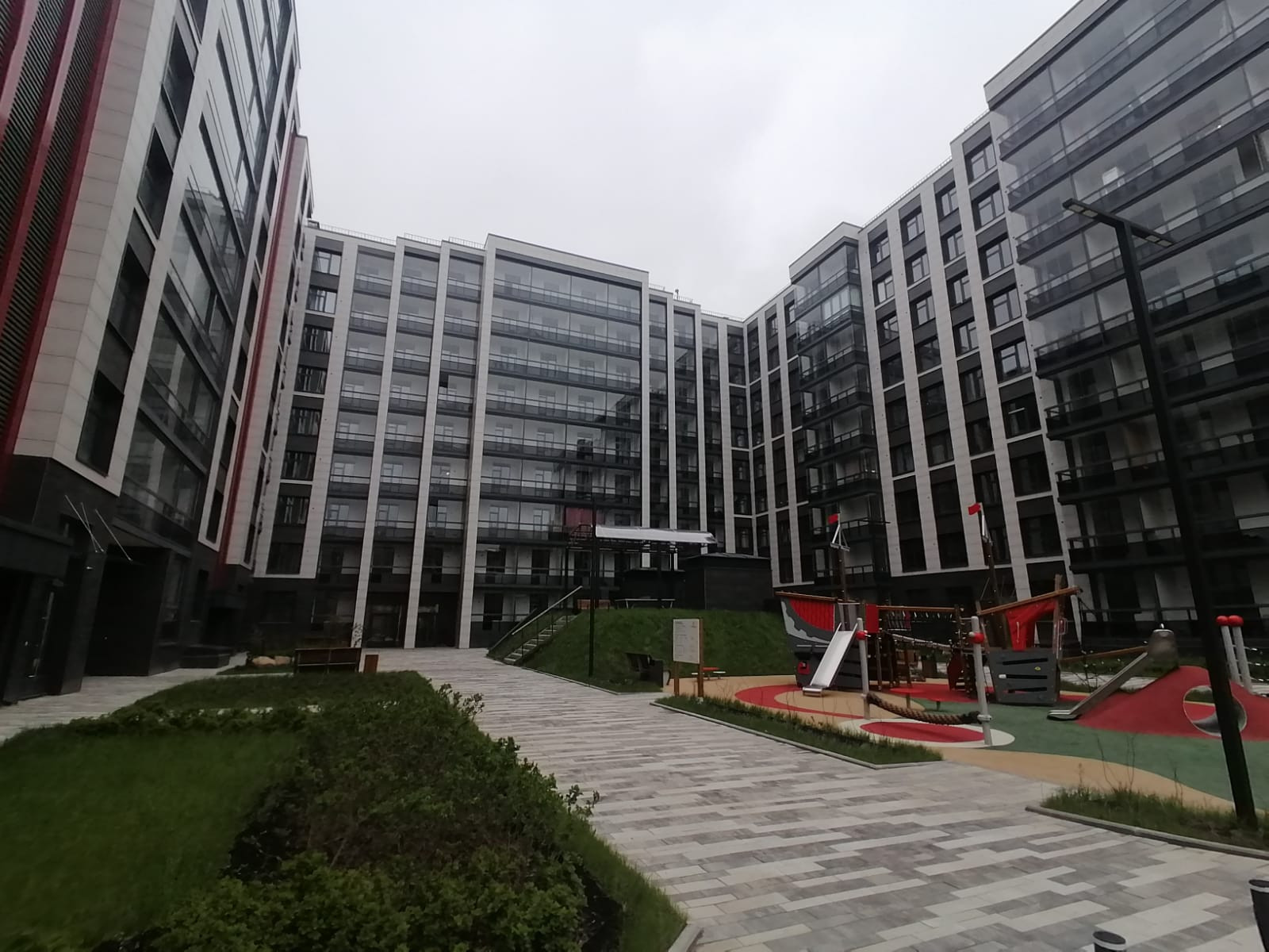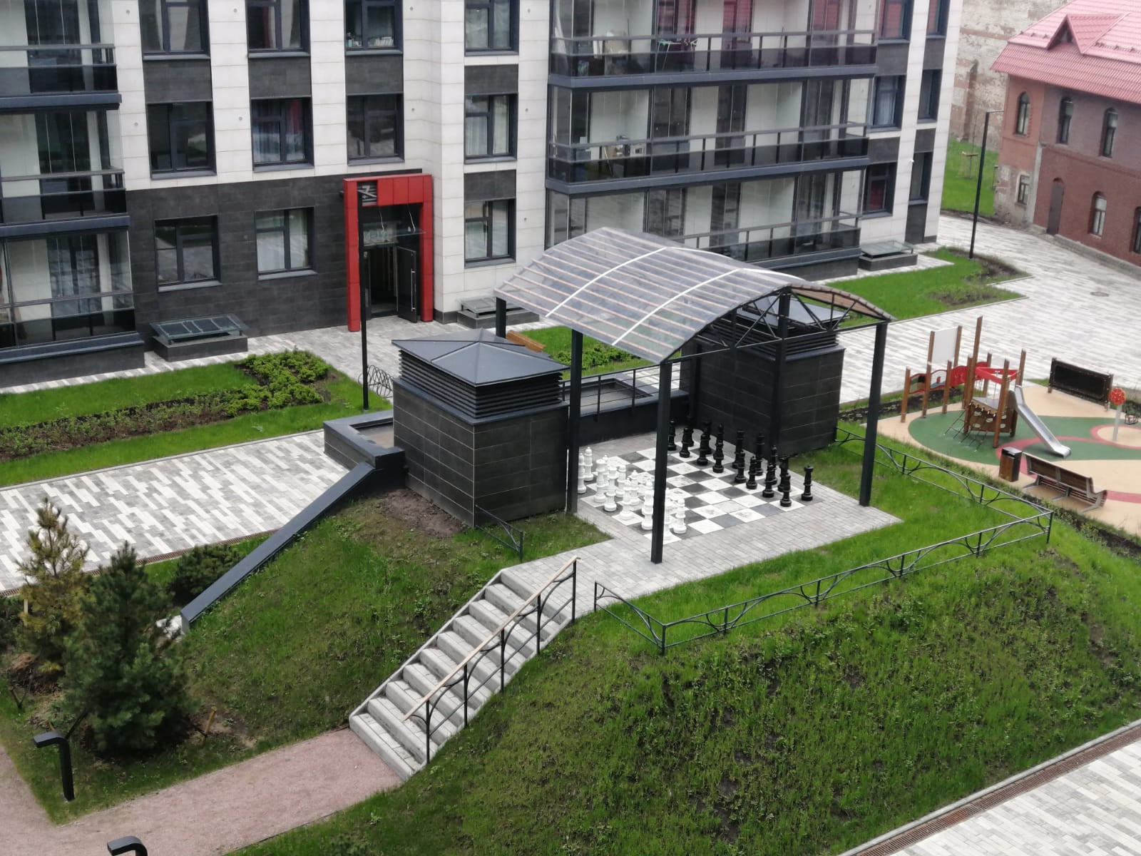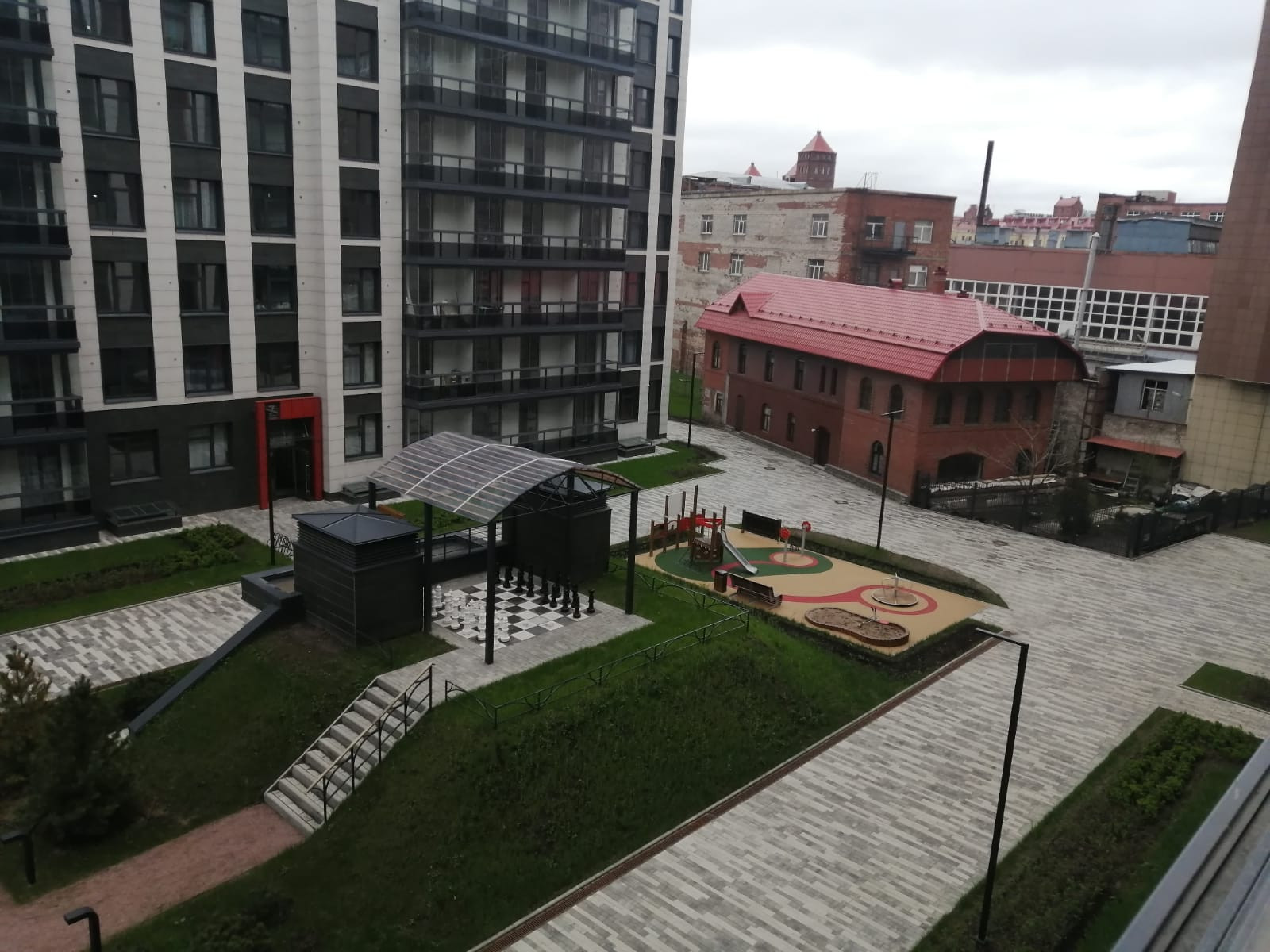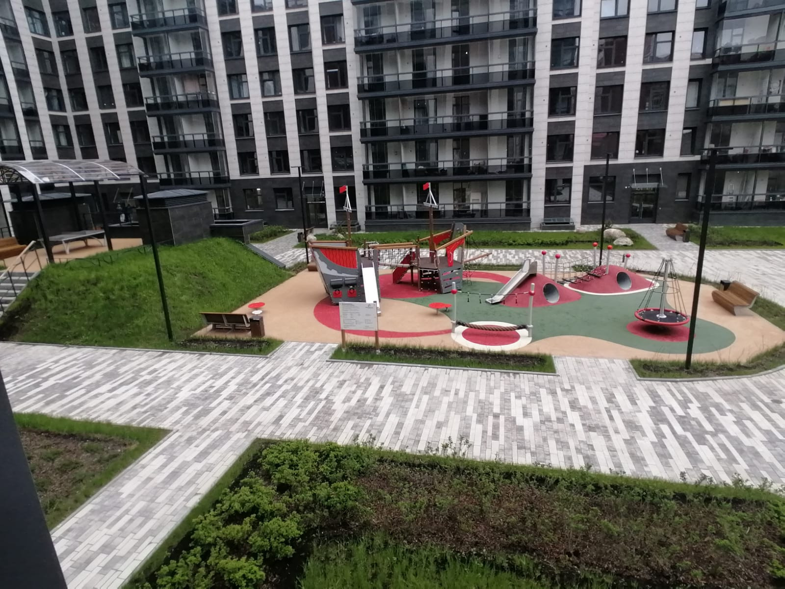 Дворы закрыты от посторонних, внутри – уютные зоны отдыха и игровые площадки под навесами.