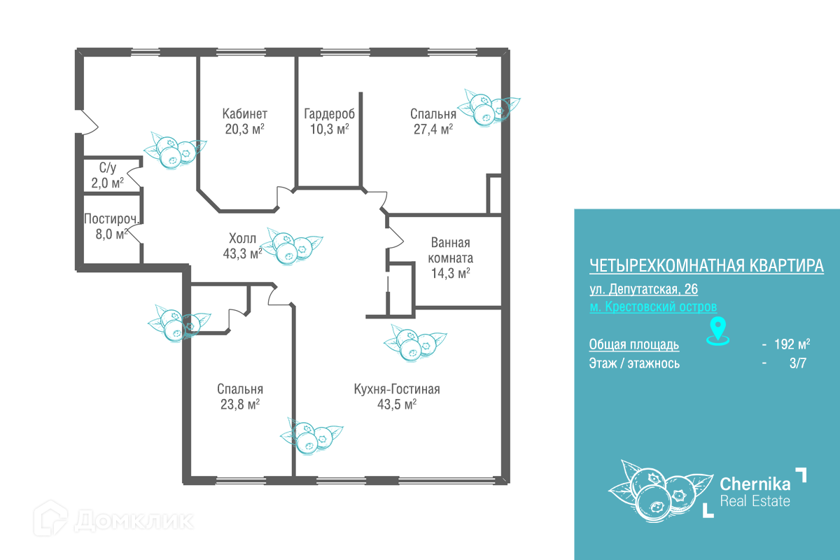 4-комнатная квартира, 192 м2, этаж 3 / 7, на продажу в Санкт-Петербурге, Депутатская улица, 26