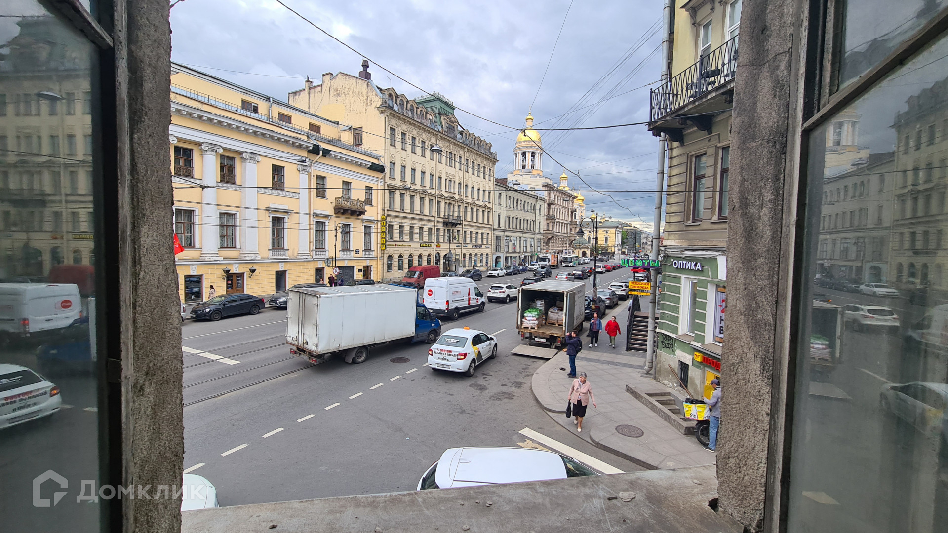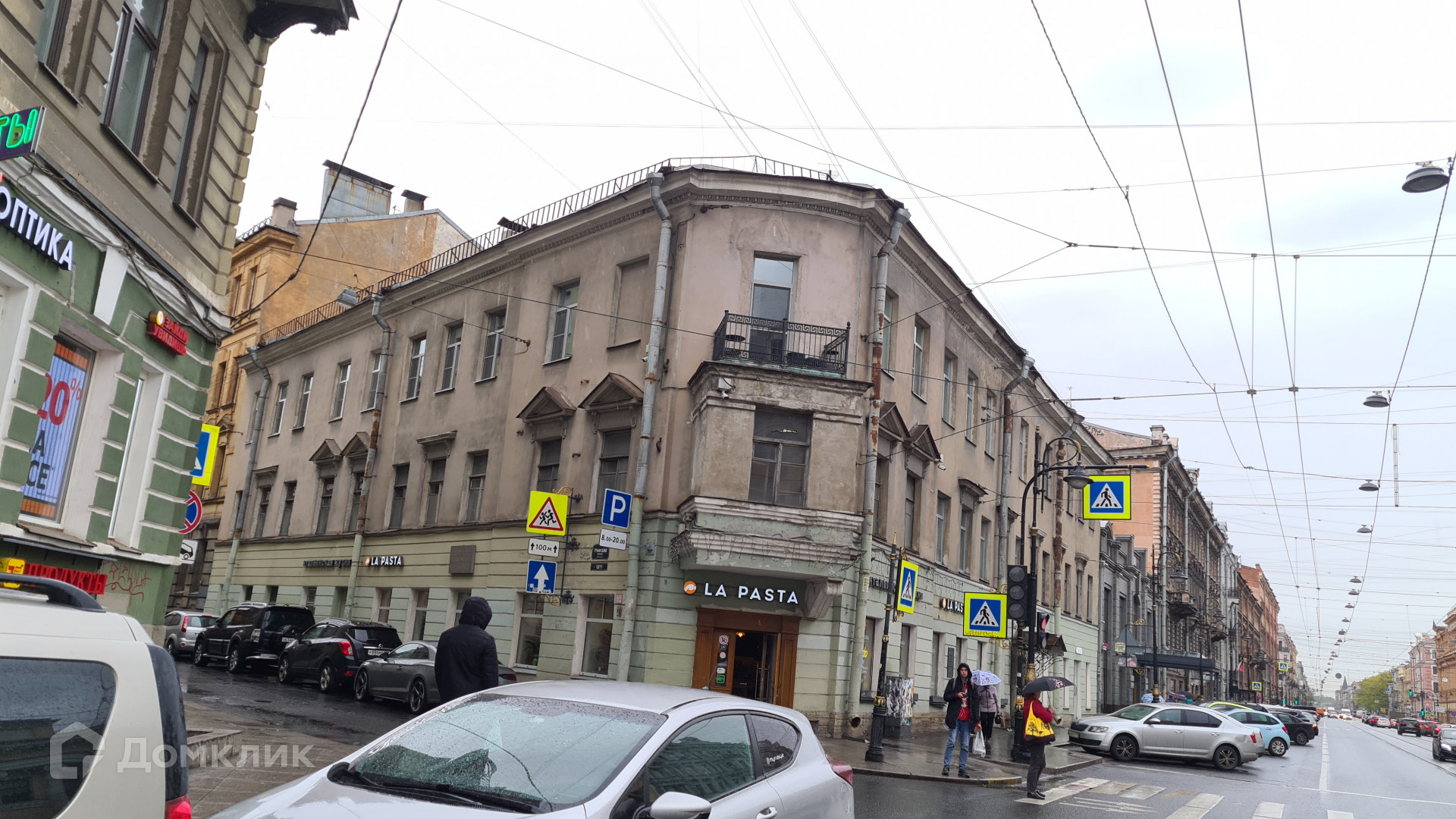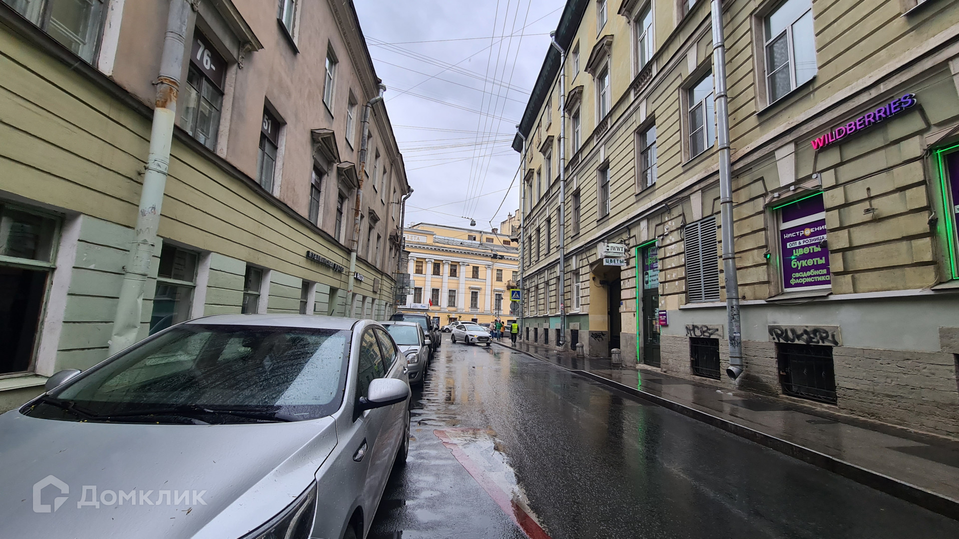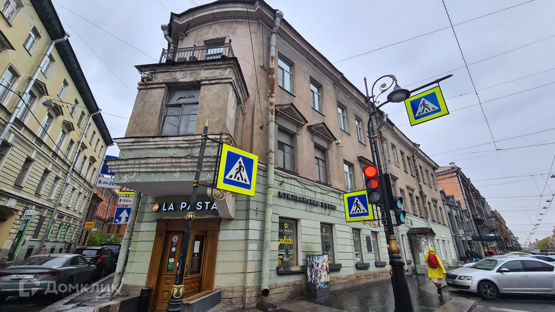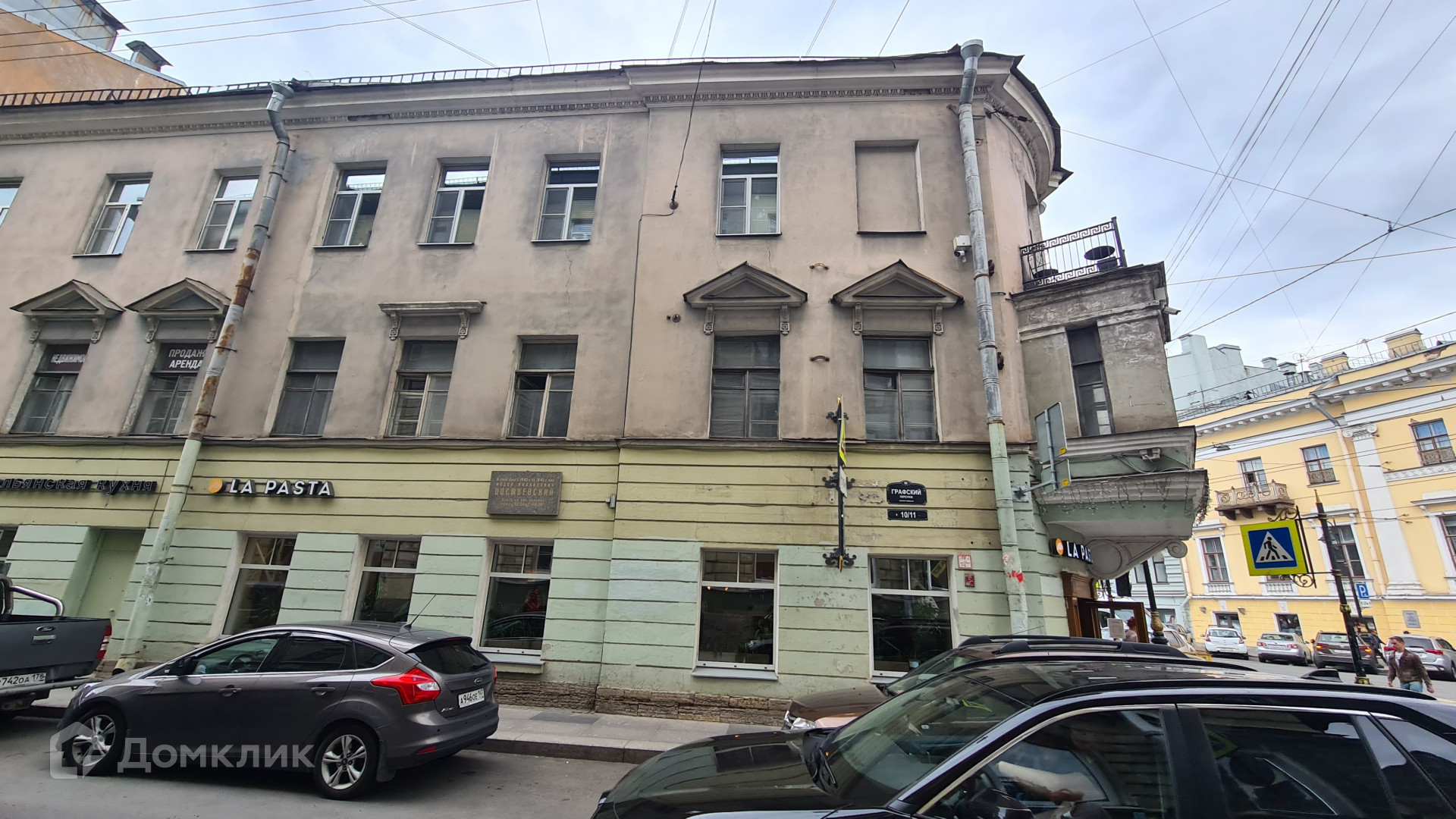 Окна выходят на Графский переулок и на Владимирский проспект.
