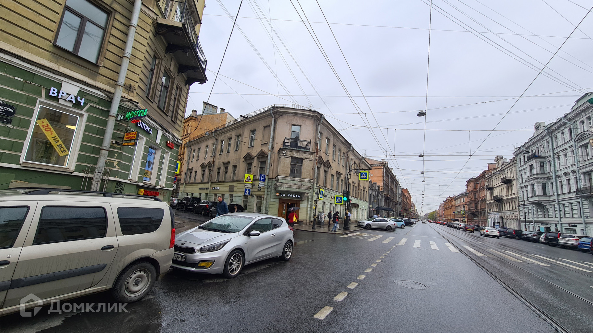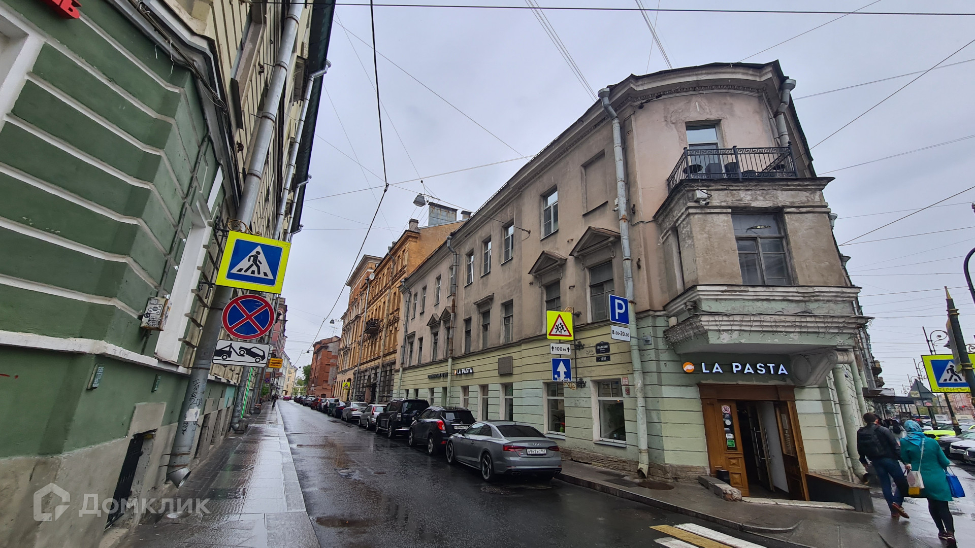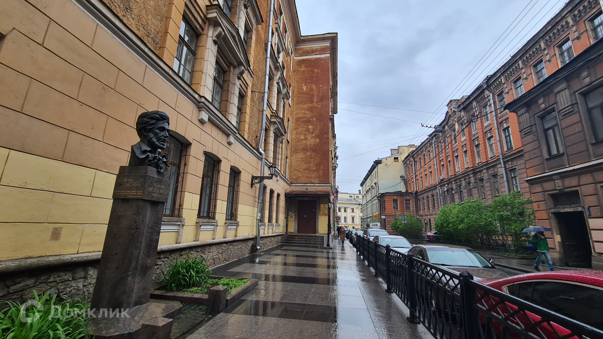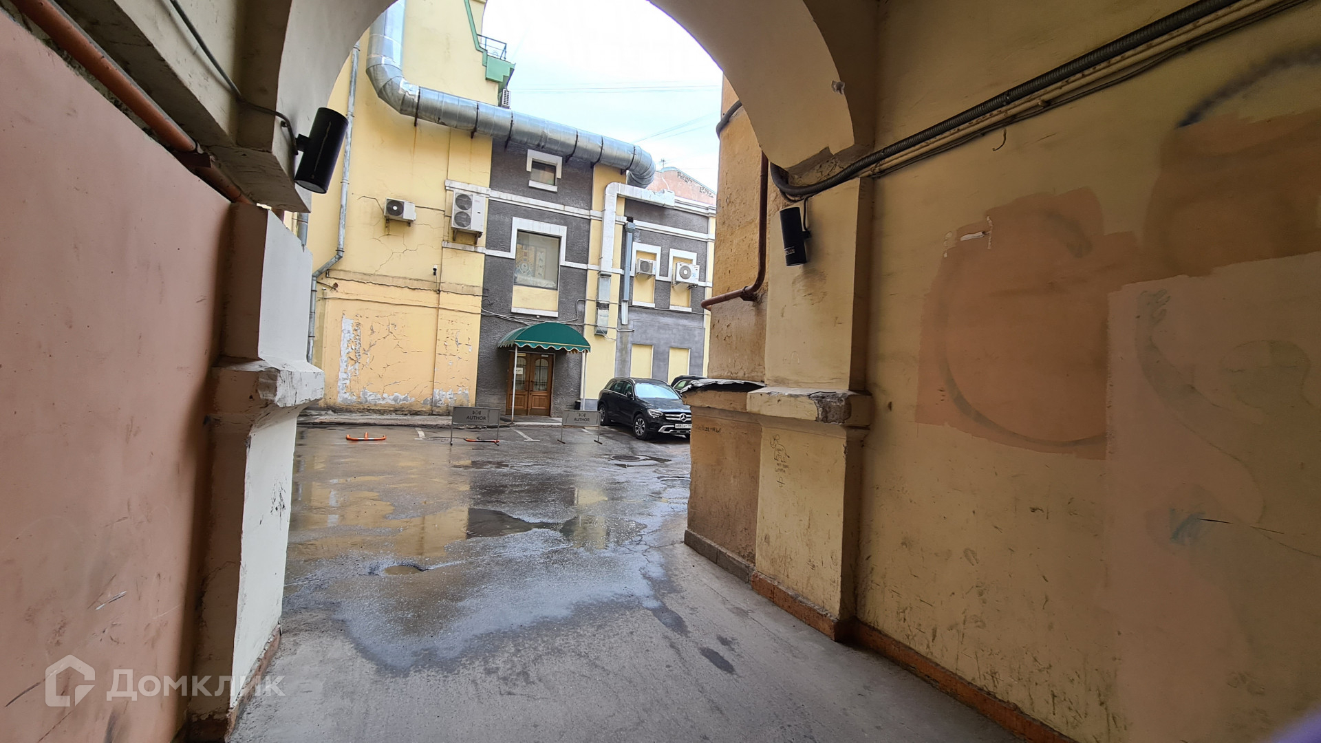 Окна выходят на Графский переулок и на Владимирский проспект.