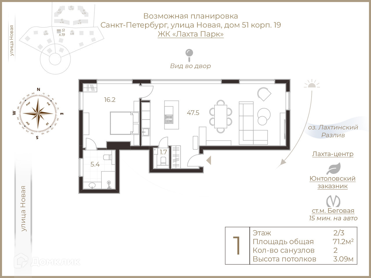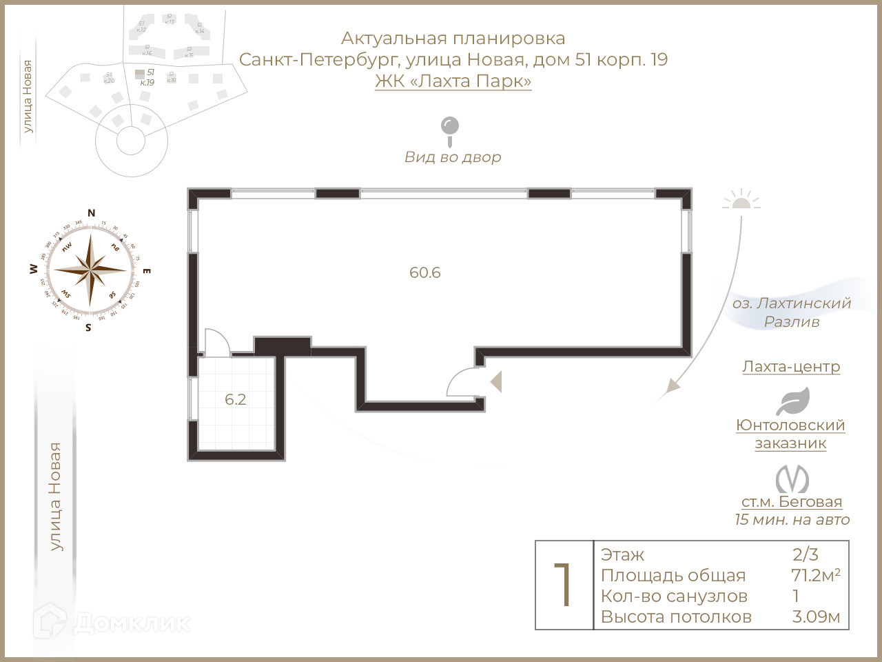 2-комнатная квартира, 71.2 м2, этаж 2 / 3, на продажу в Санкт-Петербурге, Новая улица, 51к16