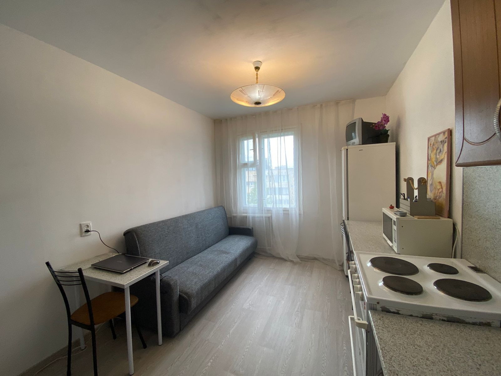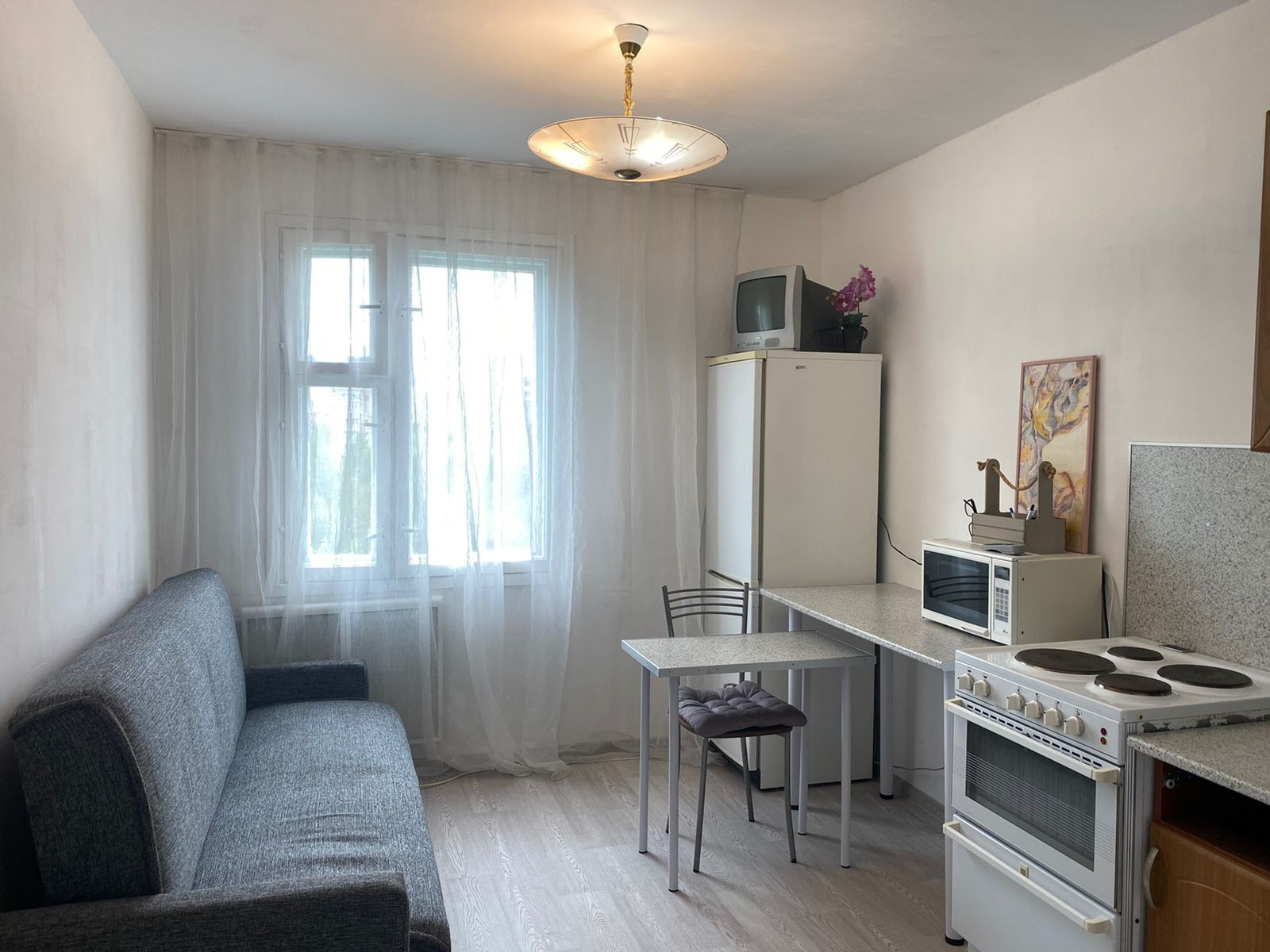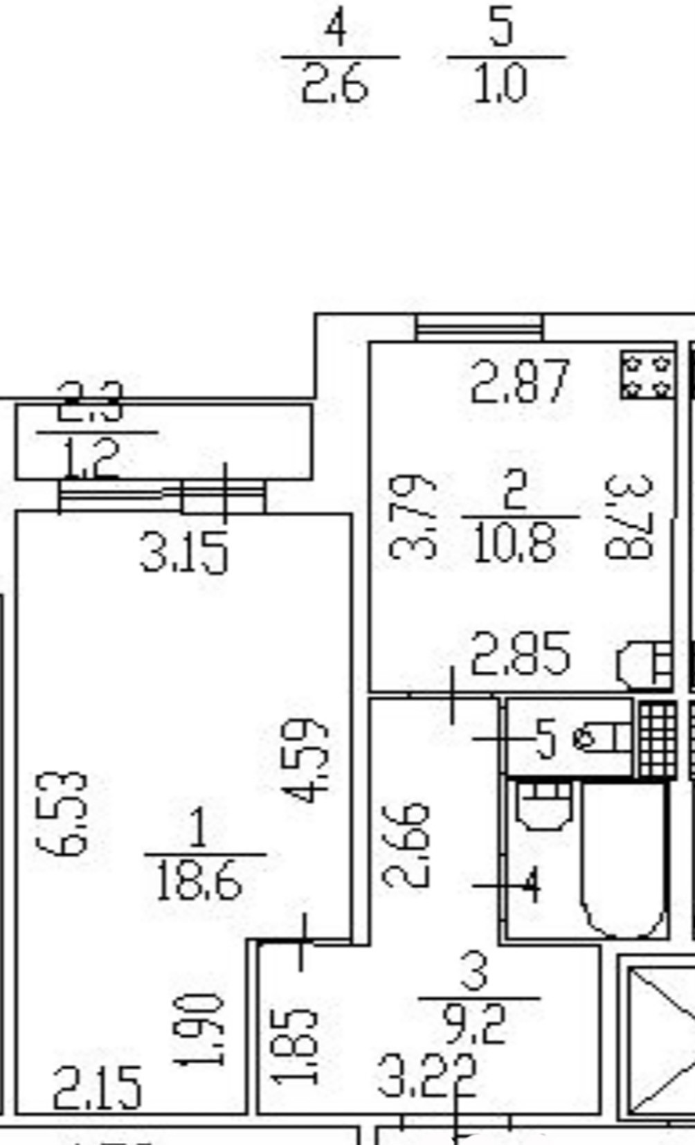Общая площадь 42,2 м (по выписке ЕГРН) + застекленная лоджия 2,3 м, кухня 10,8 м, комната 18,6, санузел раздельный, трубы поменяны. Квартира требует ремонта.
