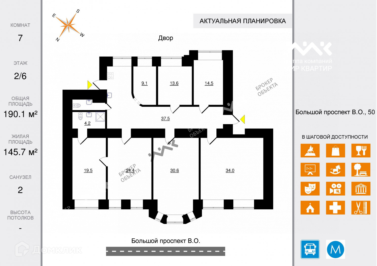Многокомнатная квартира, 190.1 м2, этаж 2 / 6, на продажу в Санкт-Петербурге, Большой проспект Васильевского острова, 50