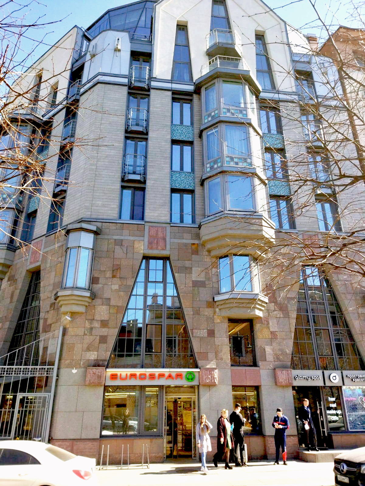 Дом отличается необычной отделкой, в отделке фасадов использованы итальянский порфир и мозаика, витражные окна в пол, стеклянный атриум и панорамный лифт. Дом облицован натуральным камнем до третьего этажа.