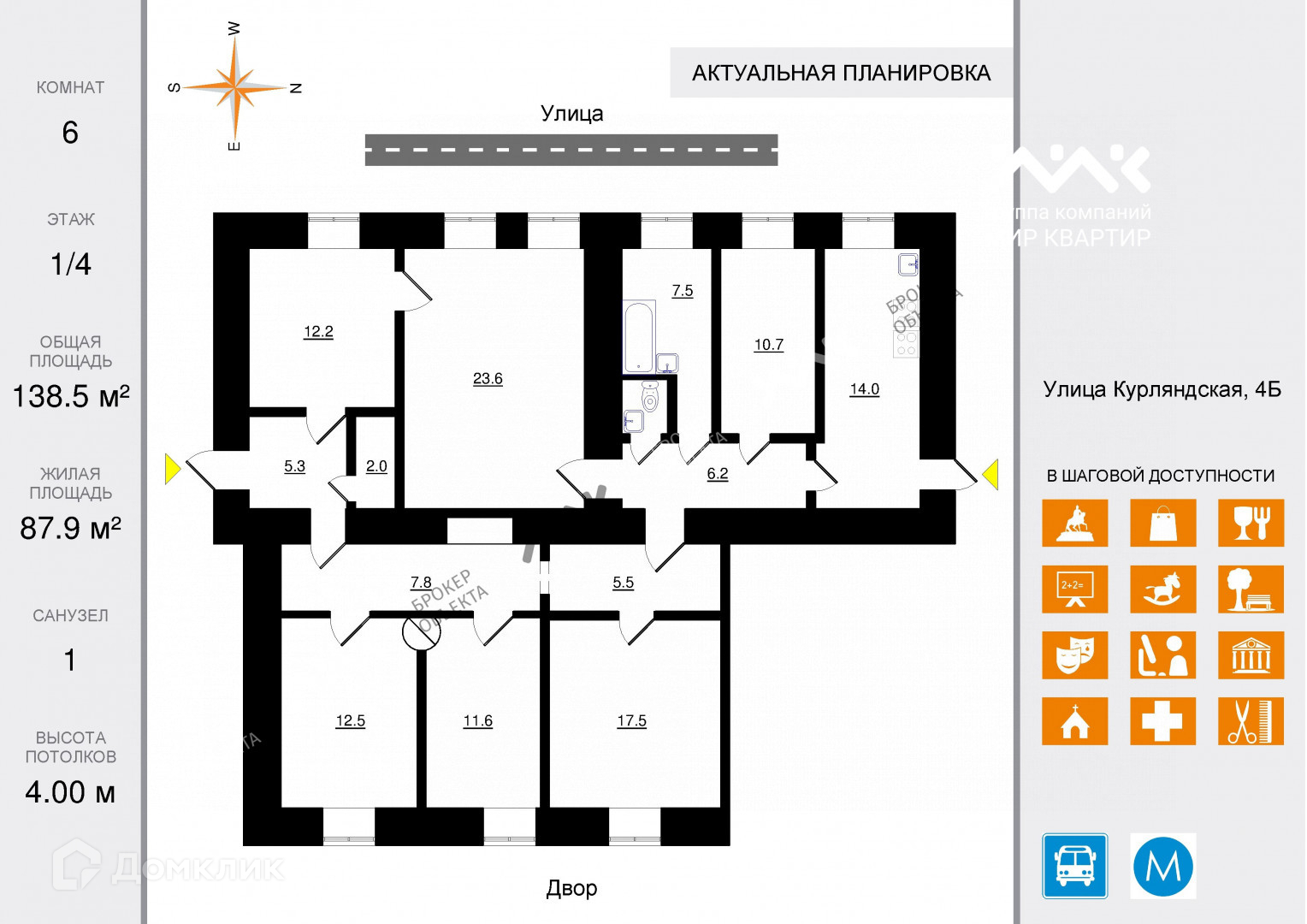 Многокомнатная квартира, 138.5 м2, этаж 1 / 4, на продажу в Санкт-Петербурге, Курляндская улица, 4