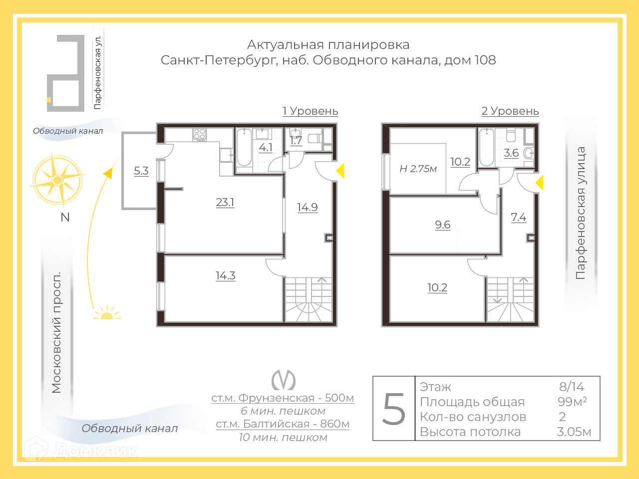 4-комнатная квартира, 99 м2, этаж 8 / 14, на продажу в Санкт-Петербурге, набережная Обводного канала, 108