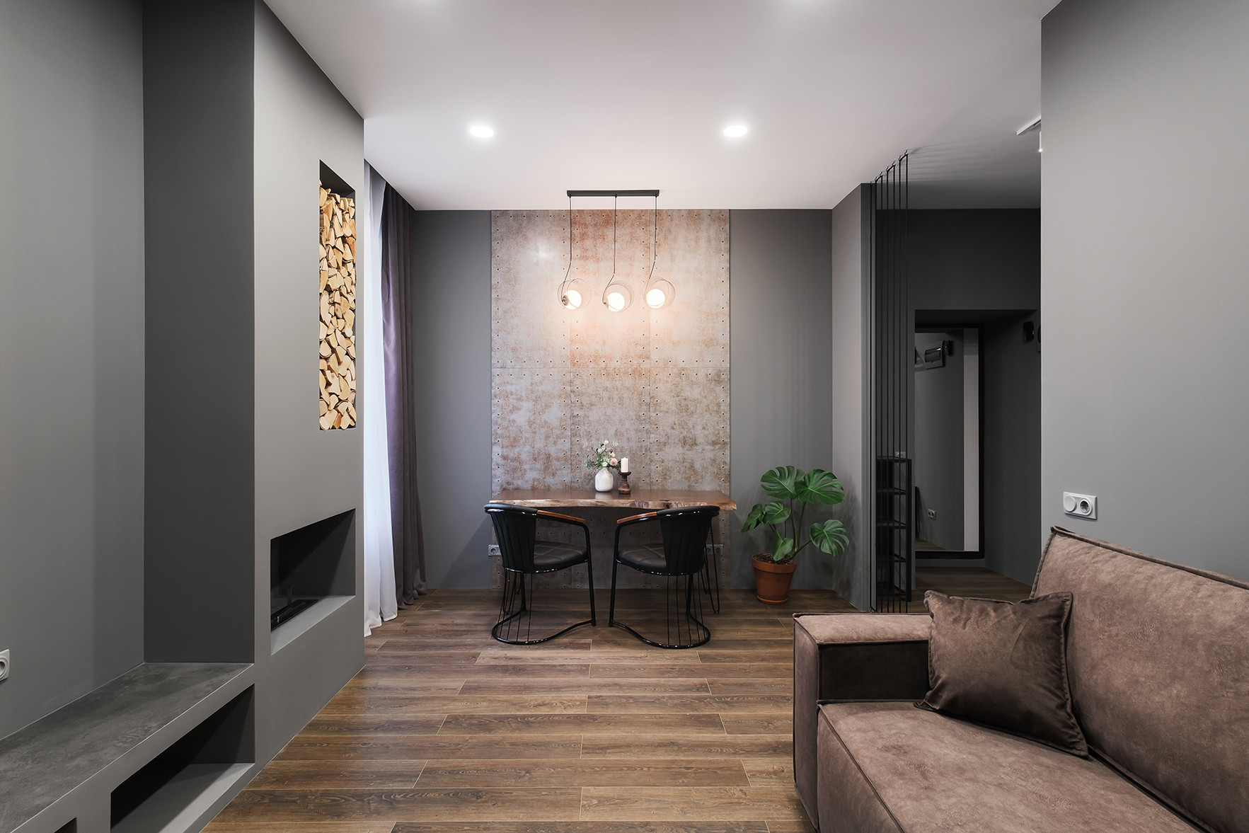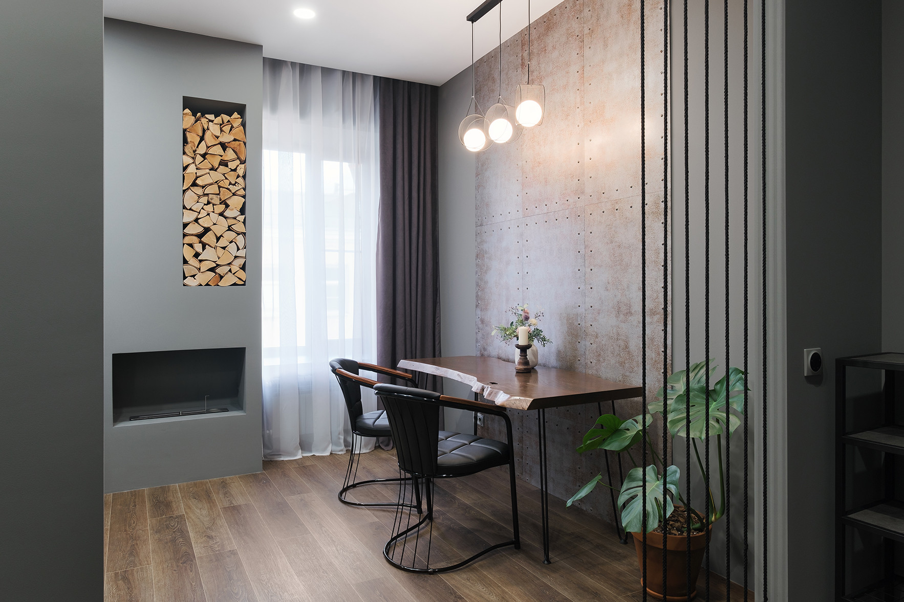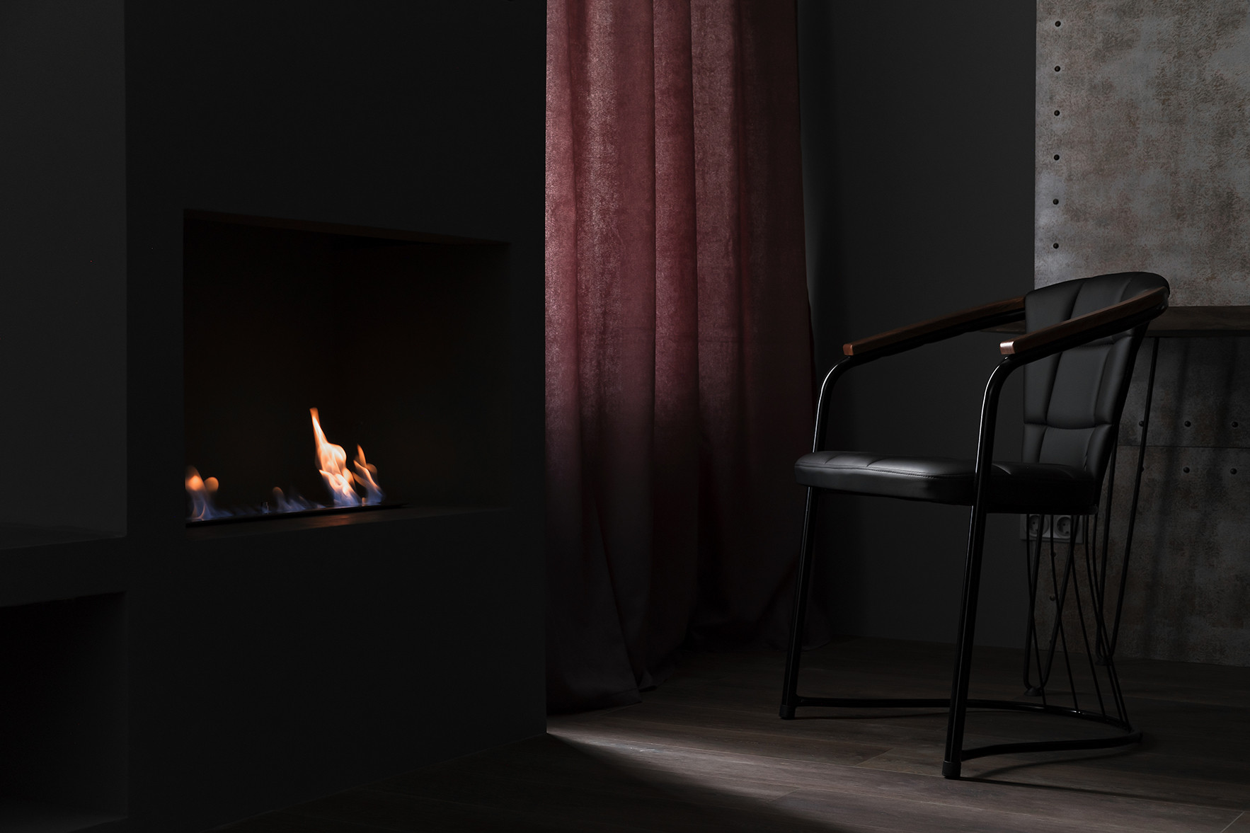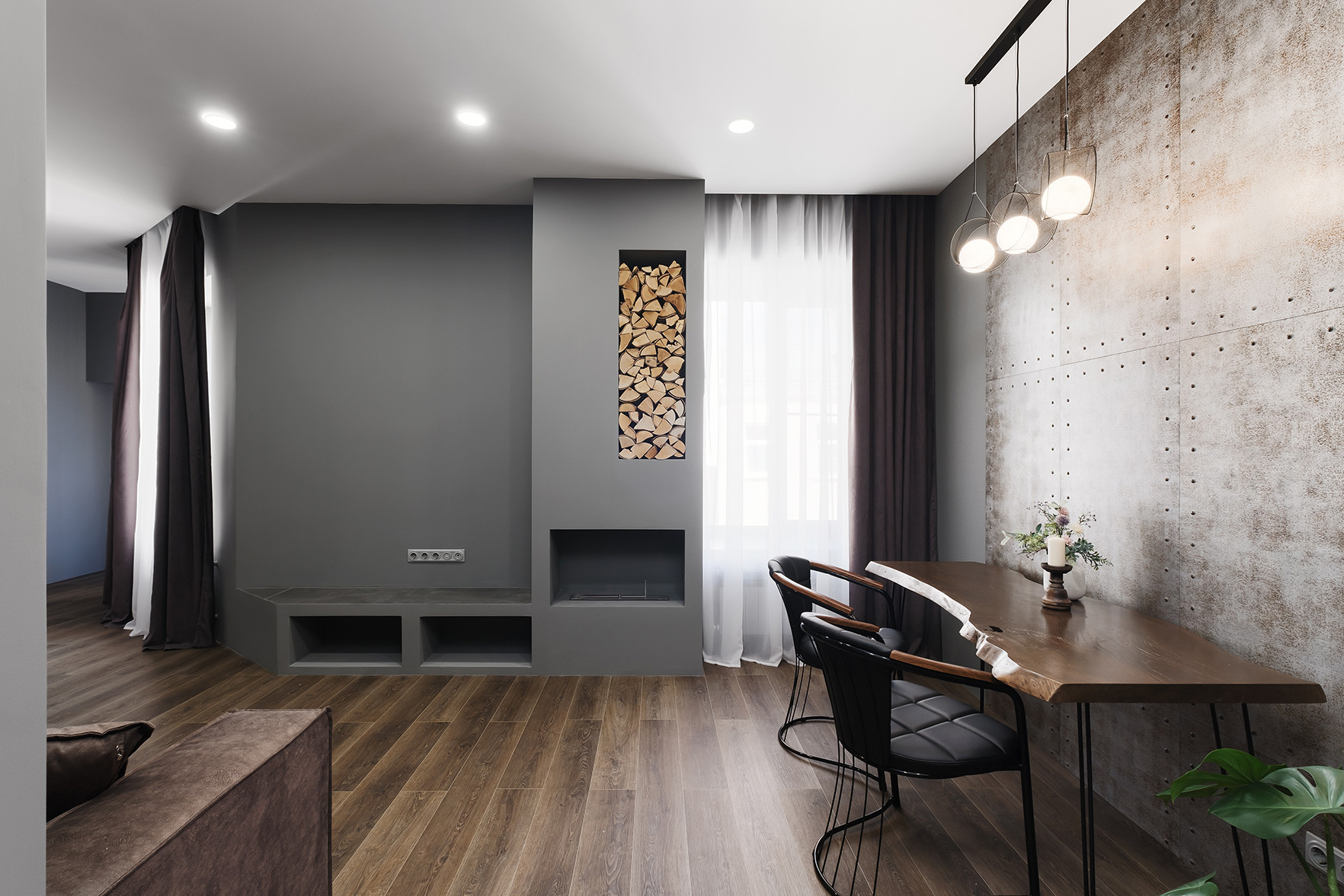 Отличительными чертами объекта являются высокие потолки 2,9 м, установленный в гостиной комнате камин на биотопливе, дизайнерские предметы интерьера. Общий современный стиль квартиры дополняет лофт-перегородка с затемнённым стеклом. Преимущественная цветовая гамма квартиры – темная и приглушенная, однако детская выполнена в светлых тонах.